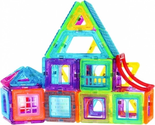 Dažādu formu un krāsu kombinācijas ļauj bērniem veidot mājas, torņus un sarežģītas ģeometriskas konstrukcijas. Stiprie magnēti nodrošina stabilu savienojumu un ērtu lietošanu.
