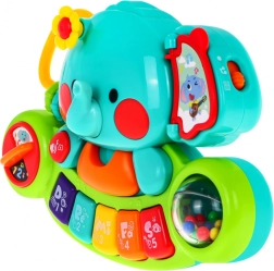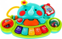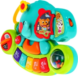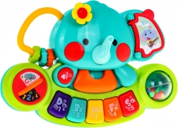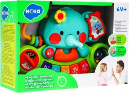 Šis košais zilonītis ar klavierēm no kvalitatīvas plastmasas izklaidēs bērnus stundām ilgi. Tas apvieno muzikālās funkcijas, gaismas efektus un interaktīvus elementus, kas veicina ziņkāri un maņu attīstību. Spēlēšana uz mini klavierēm attīsta dzirdes uztveri, roku–acu koordināciju un dabiski rosina mīlestību pret mūziku.