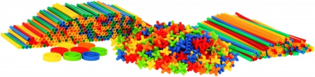 - 100 gari salmiņi, 300 īsi salmiņi, 400 dažādu formu savienotāji, aizverams bokss ar rokturi, attēlu instrukcija
