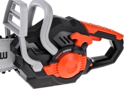 Reālistisks bērnu elektriskais ķēdes zāģis nodrošinās stundām ilgu drošu dārza spēli. Tam ir kustīga gumijas ķēde, skaņas efekti kā īstam zāģim, un komplektā atradīsiet arī aizsargbrilles vēl drošākai izklaidei. Vieglā plastmasas konstrukcija, vienkārša vadība un pievilcīgs melni pelēks noformējums ar oranžiem akcentiem iepriecinās katru bērnu.