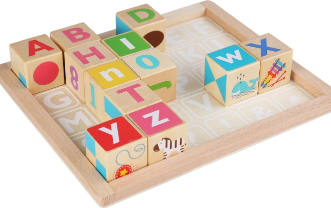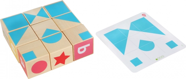 Komplektā ir arī rāmja pamatne ar alfabētu un 15 divpusējas kartītes ar īpašiem paraugiem. Bērni var pieskaņot klucīšus pareizajām vietām vai veidot attēlus pēc parauga, kas atgādina tangramu. Izgatavots no kvalitatīvas koksnes un krāsots ar netoksiskām krāsām, nodrošinot drošu un aizraujošu spēli.