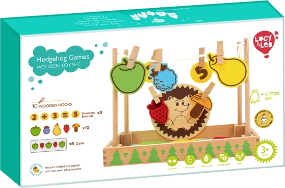 Komplektā ietilpst koka pamatne, ezītis, jautras kartītes un krāsaini filca paliktnīši – ideāli piemēroti arī kopīgām rotaļām vairākiem bērniem. Viss ir ērti ievietots praktiskā kokvilnas maisiņā vienkāršai uzglabāšanai.