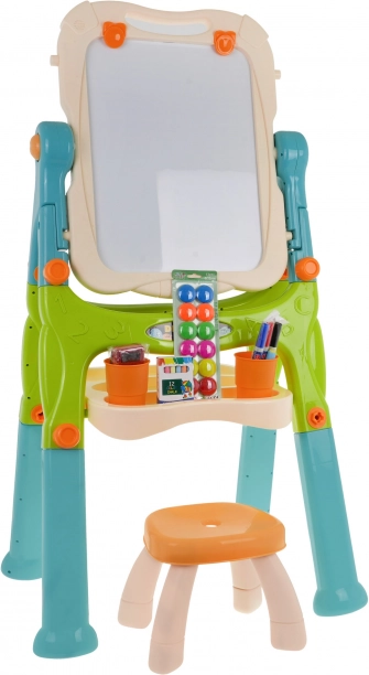 Divpusēja bērnu tāfele 2-in-1 mazajiem māksliniekiem no 3 gadu vecuma piedāvā balto magnētisko tāfeles pusi un melno krīta virsmu, plūdenu 360° pagriešanu, augstuma regulēšanu, ērtu plauktiņu piederumiem un komfortablu tabureti. Komplektā iekļauti notīrāmi marķieri, krītiņi, magnēti un papīra turētājs bezgalīgai radošai izklaidei.