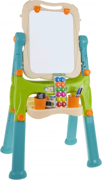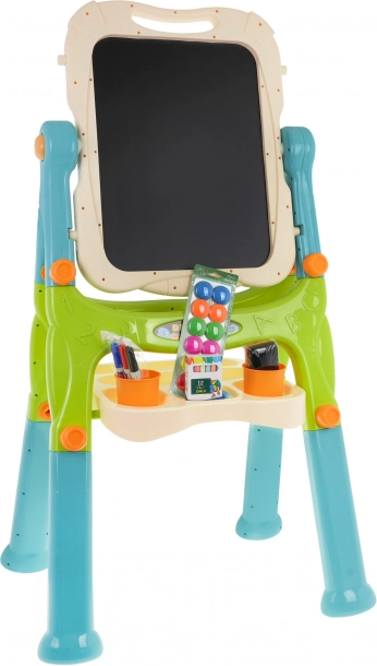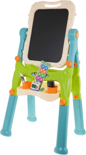 Šis radošais komplekts apvieno balto magnētisko tāfeli rakstīšanai ar marķieriem un magnētu stiprināšanai ar melnu krīta virsmu klasiskai zīmēšanai. Tāfeli var pagriezt par 360°, tai ir noapaļotas malas drošai lietošanai, un, pateicoties maināmajām garākajām un īsākajām kājām, to viegli pielāgot bērna pašreizējam augumam. Praktiskais plauktiņš tur visus piederumus pa rokai, bet integrētie klipši ļauj zīmēt arī uz papīra.