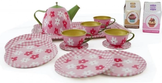 Šis metāla trauku komplekts bērniem sniedz jautrību un radošumu, spēlējoties tējas ballītē. Tas ietver visas svarīgās sastāvdaļas perfektai spēlei, piemēram, paplāti, tējkannu, tasītes, apakštasītes, deserta šķīvjus un divus pārtikas maketus.