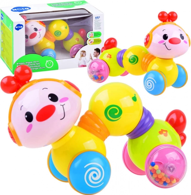 Interaktīvais braucošais kāpurs Happy Wiggle Worm ir ideāla rotaļlieta zīdaiņiem un mazuļiem. Pēc muguras nospiešanas kāpurs izstiepsies un dosies uz priekšu pa līdzenu virsmu, kamēr galviņa maina krāsas un skan patīkamas melodijas. Grozāma galva veicina ziņkāri un sīko motoriku.