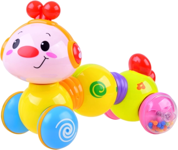 Nospiediet muguriņu, un kāpurs izstiepsies un dosies uz priekšu. Lieliski motivē rāpot un attīsta rupjo motoriku.