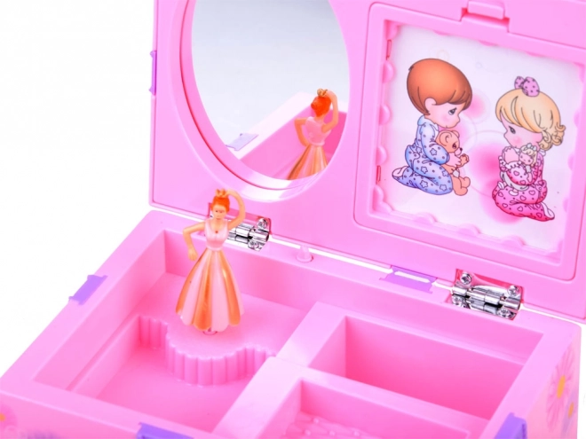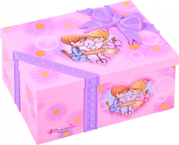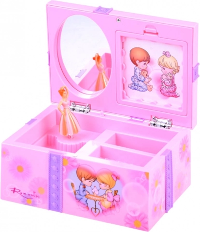 Šī pievilcīgā rozā toņu rotaslietu lādīte ir rotāta ar ziediem un mīlīgām meitenītes un puisīša ilustrācijām. Atverot, balerīna sāk griezties un atskan patīkama melodija, kas rada pasakainu noskaņu ikdienas pucēšanās un rotu glabāšanas brīžos.