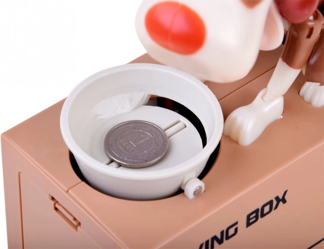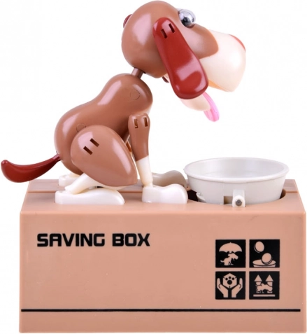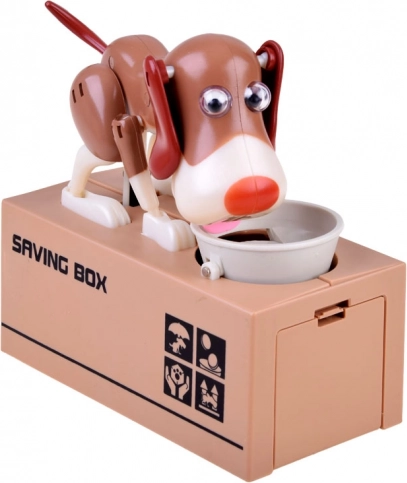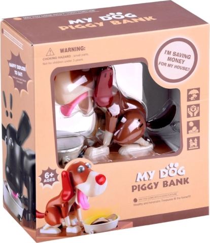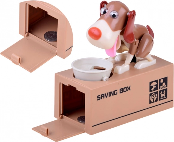 Iemetiet monētu bļodiņā suņa priekšā. Suns sāk kustēties tā, it kā ēstu no bļodiņas, un monēta iekrīt krājkasē. Suns jautri kustas un purina ausis. Darbojas ar 3 baterijām. Krājkase palīdz bērniem saprast, ka taupīšana ir ne tikai aizraujoša, bet arī nes pozitīvus rezultātus.