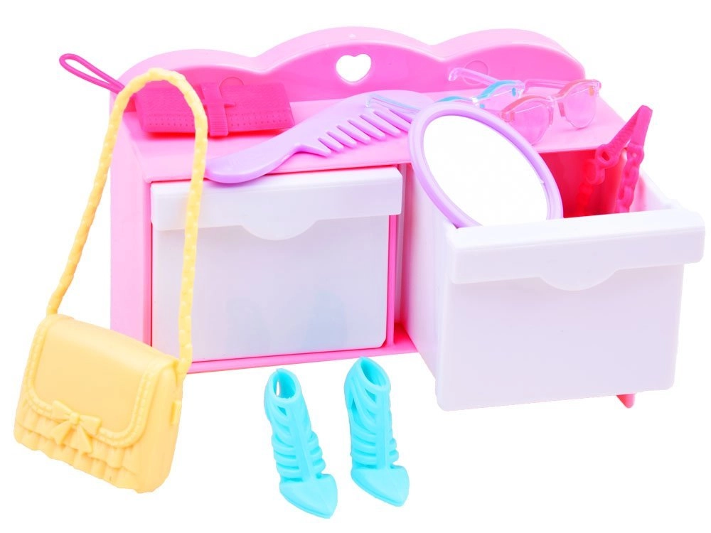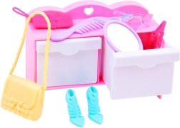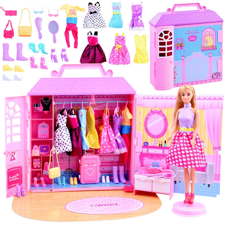 - Lelles komplekts ar pārnēsājamu drēbju skapi un aksesuāriem