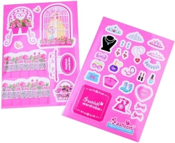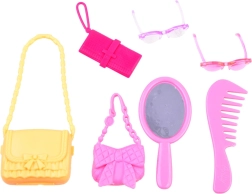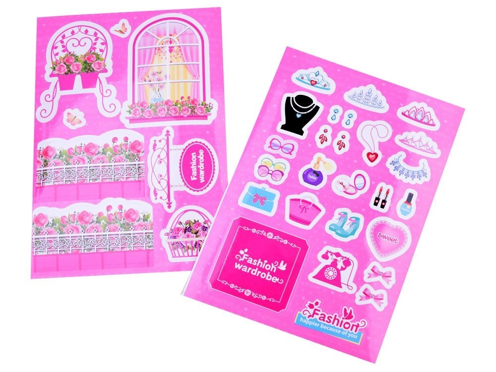 Komplektā ir daudzveidīga kleitiņu, kurpju, somiņu izlase, ķemme, spogulītis un arī brilles, kā arī uzlīmes garderobes personalizēšanai. Bezgalīgas kombinēšanas iespējas.