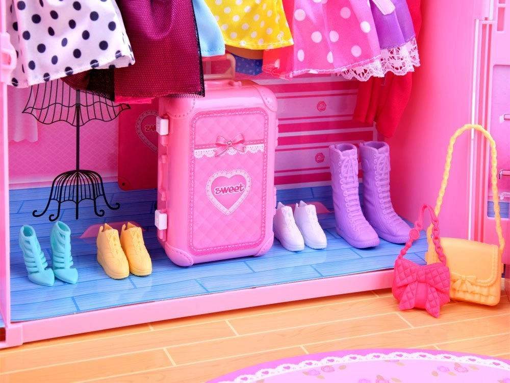- Lelle, pārnēsājama garderobe (mājiņa), vairākas kleitas un tērpi, vairāki kurpju pāri, somiņas un modes aksesuāri, ķemme, spogulītis, uzlīmes