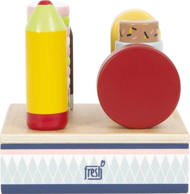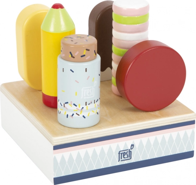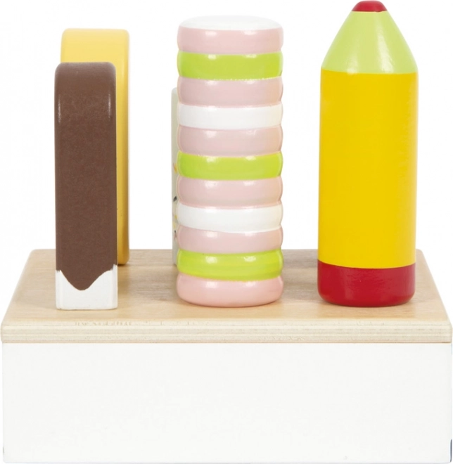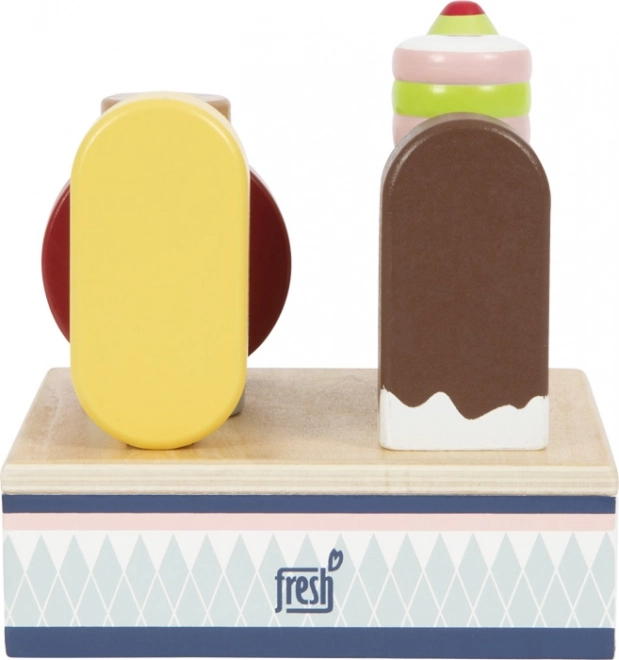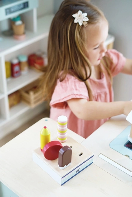 Šis koka saldējumu komplekts ir ideāli piemērots spēlei “veikaliņā” vai “kafejnīcā”. Izturīgais statīvs pārskatāmi notur visus sešus saldējumus, lai mazās rokas varētu viegli izvēlēties iecienīto “garšu” un apkalpot “klientus”. Pateicoties sertificētam FSC kokam, rotaļlieta ir ne tikai skaista, bet arī dabai draudzīga.