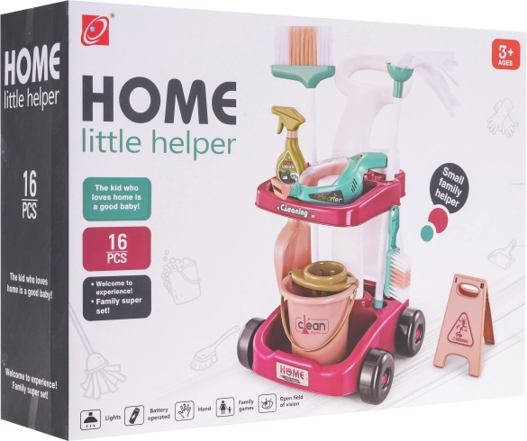 Šis bagātīgais uzkopšanas komplekts izgatavots no kvalitatīviem un drošiem materiāliem un sajūsminās mazos palīgus ar realistiskām detaļām. Bērni trenēs motoriku, apgūs kārtības paradumus un izbaudīs radošu lomu spēli mājās vai bērnudārzā. Ratiņus ir viegli vadīt, pateicoties lieliem riteņiem un ērtam rokturim, visam ir sava vieta uz praktiskajiem plauktiņiem.
