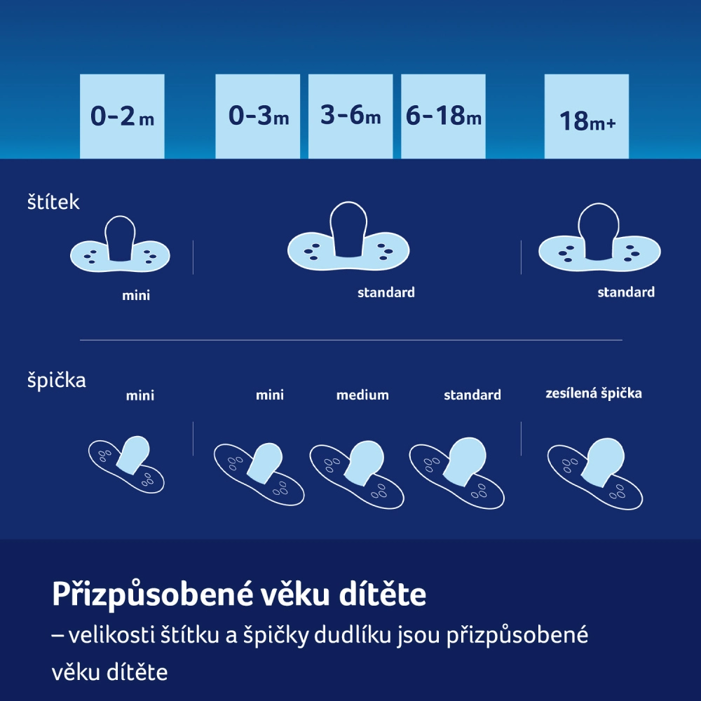 - Dinamiskais uzgalis: novērš košļāšanas refleksu, atbalsta dabisku rīšanu un pareizu sakodiena veidošanos.