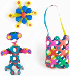 - 42 elementi / 6 krāsas – veidojiet dzīvniekus, ziedus, somas, robotus un fantāzijas formas.