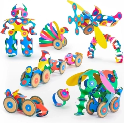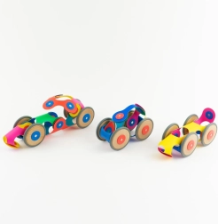 CLIXO Wheel Creator ir elastīgs magnētiskais konstruktoru komplekts bērniem 6–10 gadu vecumā, kas attīsta radošumu, telpisko uztveri un smalko motoriku. Pateicoties rotējošiem magnētiem ar fiksāciju 24 pozīcijās, modeļi labi saglabā formu un iztur dinamisku spēli. Koka riteņi iedzīvina jūsu veidojumus – no automašīnām un vilcieniem līdz mīlīgiem dzīvnieciņiem – un tas viss košās varavīksnes krāsās.