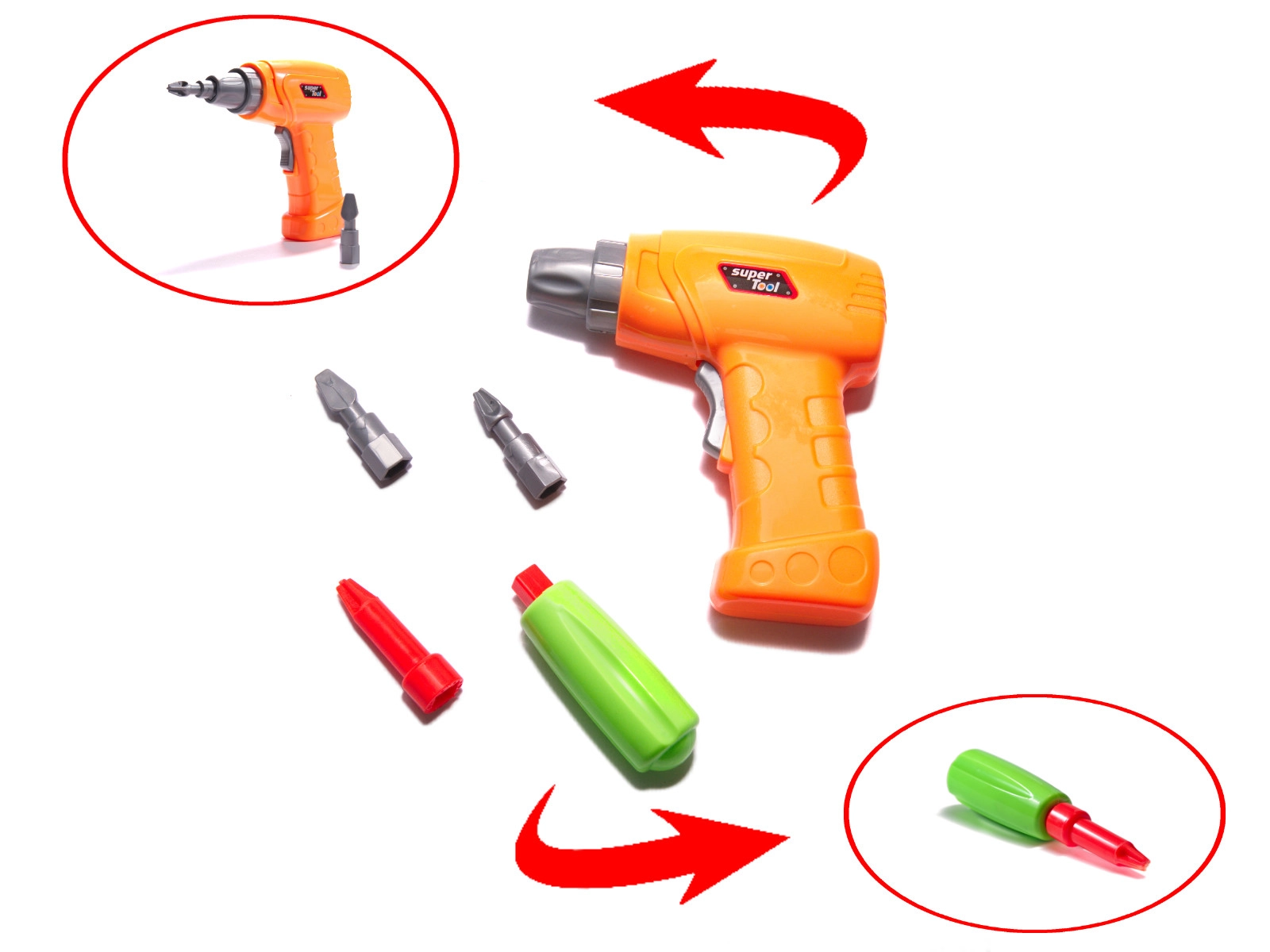 Plastmasas urbjmašīna ar maināmiem uzgaļiem un reālistiskām skaņām autentiskai spēlei.