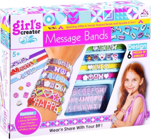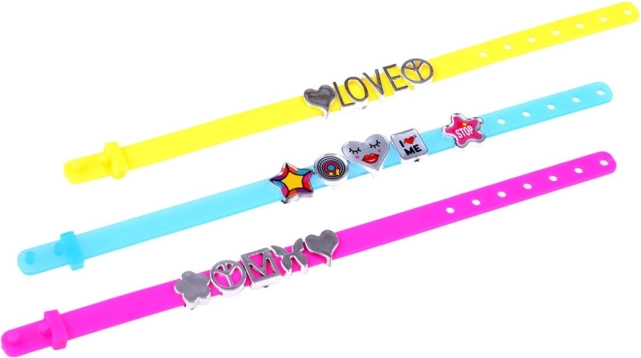 Radošais komplekts satur visu nepieciešamo skaistu un radošu rokassprādžu veidošanai. 5 siksniņas dažādās krāsās ar regulējamu aizdari ļauj pielāgot dažādiem delna izmēriem. Plastmasas burtiņus un rotājumus var brīvi kombinēt vārdu, frāžu un rakstu veidošanai – iespējas ir neierobežotas! Šī nodarbe vienlaikus attīsta radošumu, veiklību un iztēli.