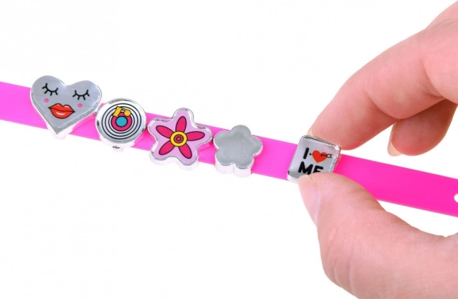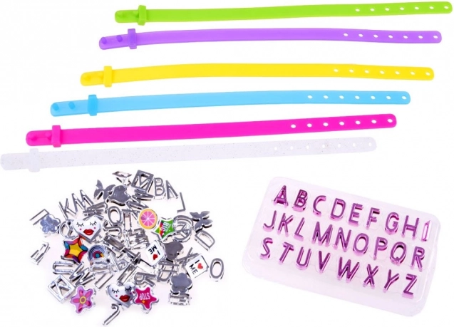Komplektā ir siksniņas košās krāsās ar iespēju pievienot iecienītus rotājumus un burtiņus.