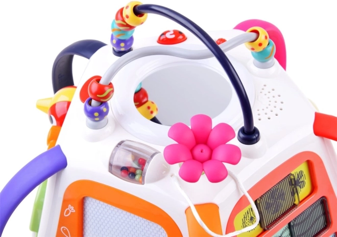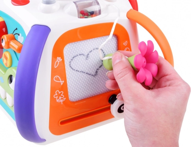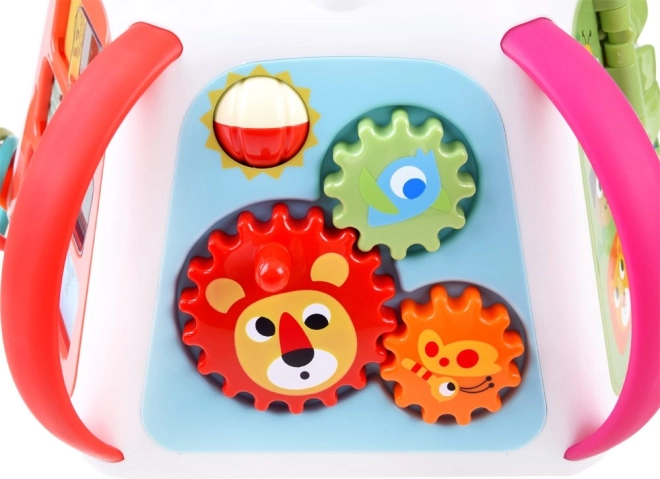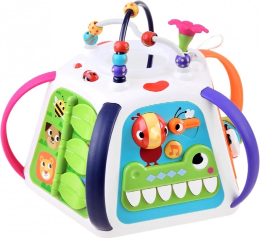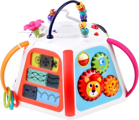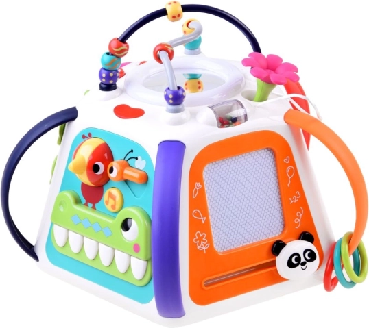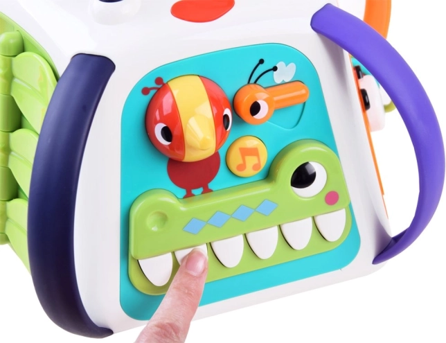 Ieslēdzot kubu, tas atskaņo melodijas, skaņas efektus un gaismas elementus, kas motivē bērnus turpināt izpēti. Neiztrūkst klavierītes krokodila zobu veidolā, kustīgi elementi, bīdāmie paneļi ar optisko “dzīvās” animācijas efektu un drošs spogulītis.