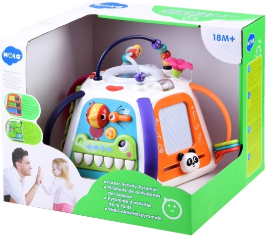 Izglītojošais HOLA daudzfunkcionālais kubs piedāvā plašu aktivitāšu klāstu vienā kompaktā rotaļlietā. Katra puse attīsta citu prasmi: no zīmēšanas uz tāfelītes, caur zobratu griešanu, līdz dzīvnieku atklāšanai zem lapiņām ar skaņas atgriezenisko saiti. Augšdaļu rotā krellīšu labirints, kas veicina roku-acu koordināciju.