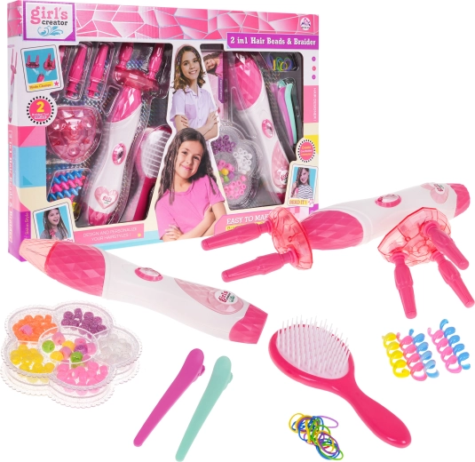 Komplektā ir arī suka, sprādzes, spirālītes un daudz gumiju perfektai frizūras pabeigšanai. Lieliski piemērots rotaļām, ballītēm un ikdienas stilam, attīsta radošumu un nodrošina drošu izklaidi bērniem no 5 gadu vecuma.