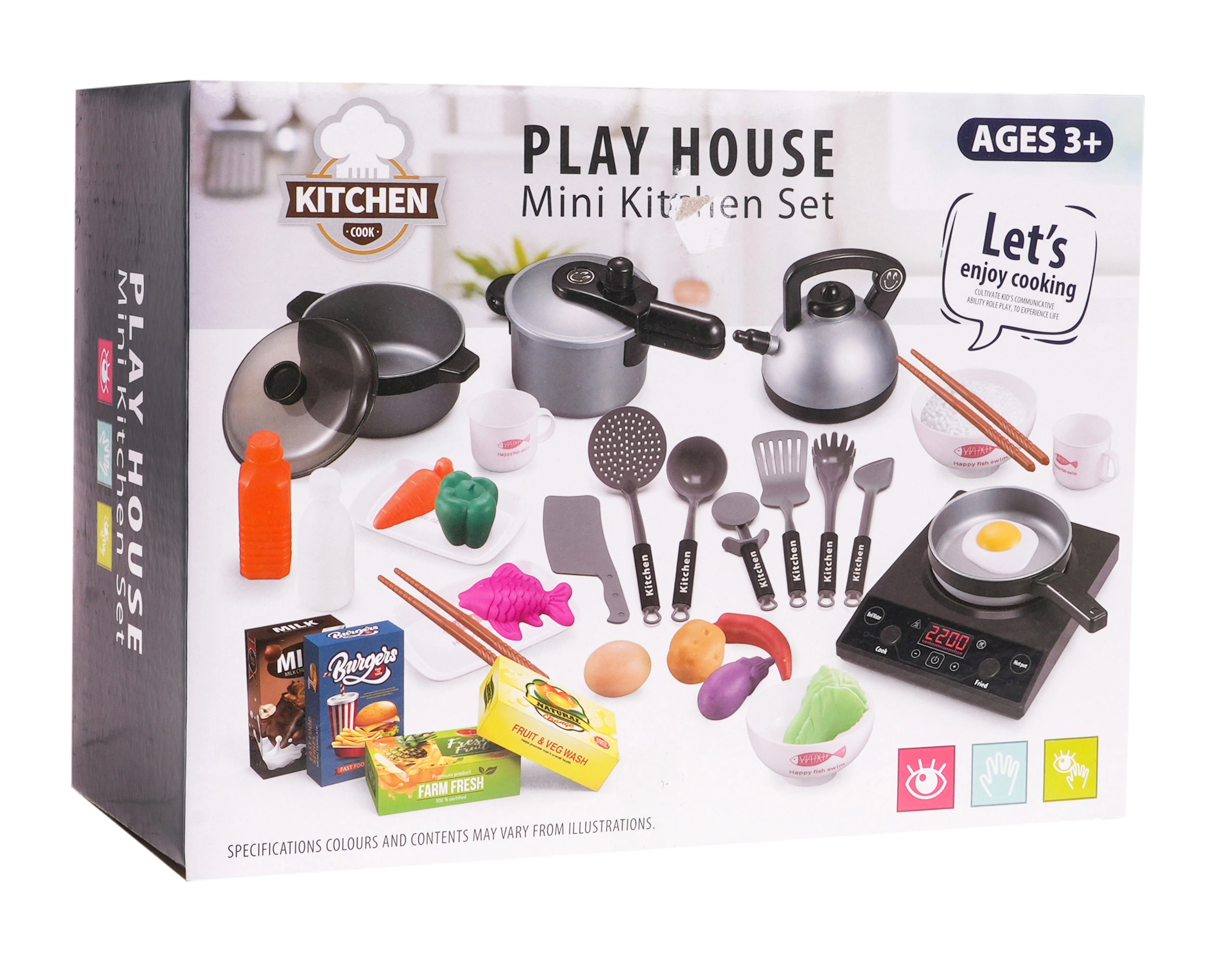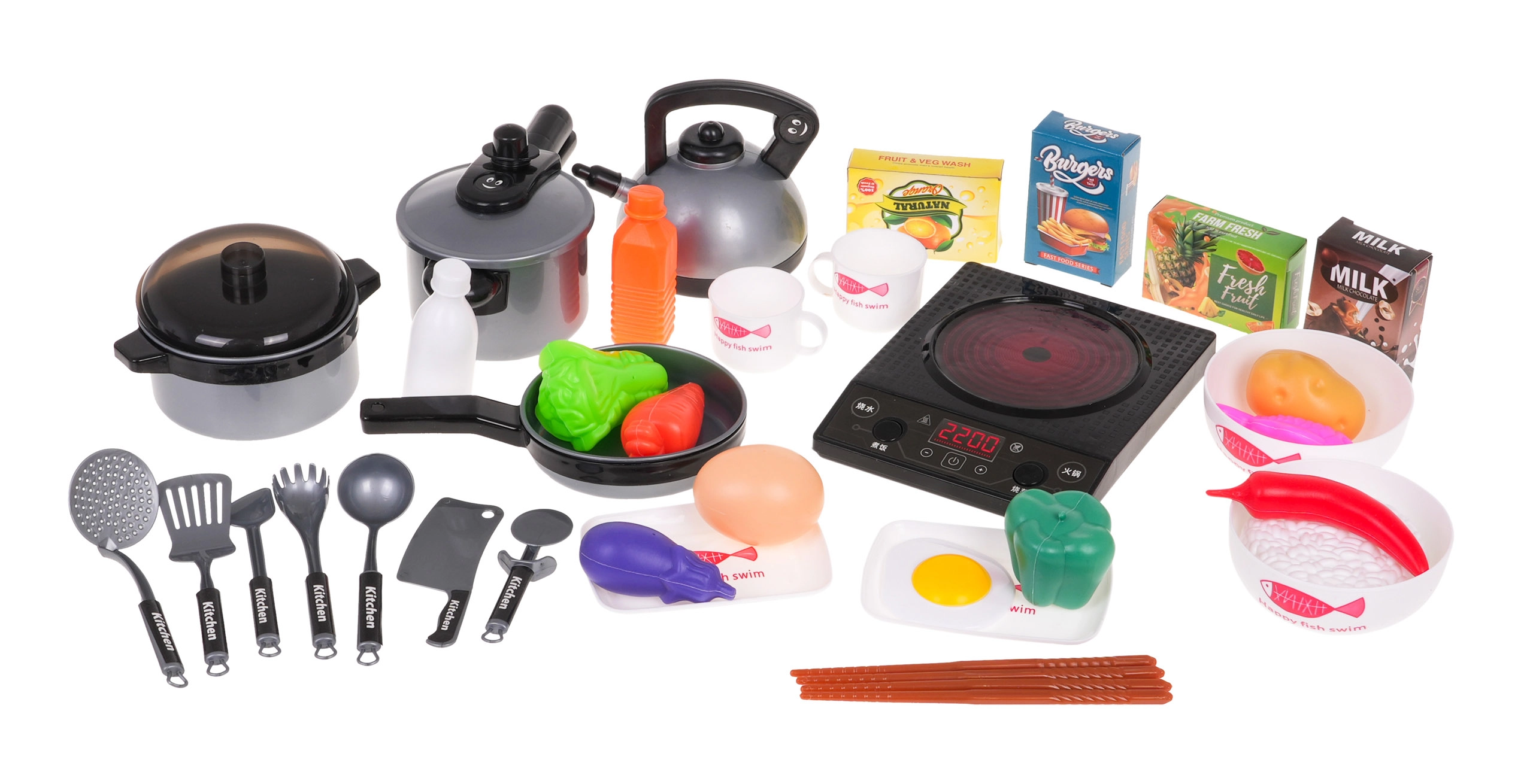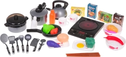 Šis lieliskais virtuves komplekts ietver visu, kas mazajam pavāram var būt nepieciešams. Indukcijas plīts, kas darbojas ar trim AA baterijām, nodrošina reālistiskas cepšanas un vārīšanas skaņas, bet drošie plastmasas elementi, piemēram, katli, pannas un citi piederumi, ir ideāli bērnu rotaļām, bez asām malām un savainojumu riska. Komplektā ir dažādas pārtikas imitācijas, tostarp olas, zivs un dārzeņi, kas piešķir rotaļām autentiskumu.