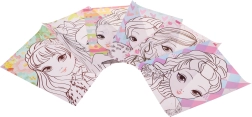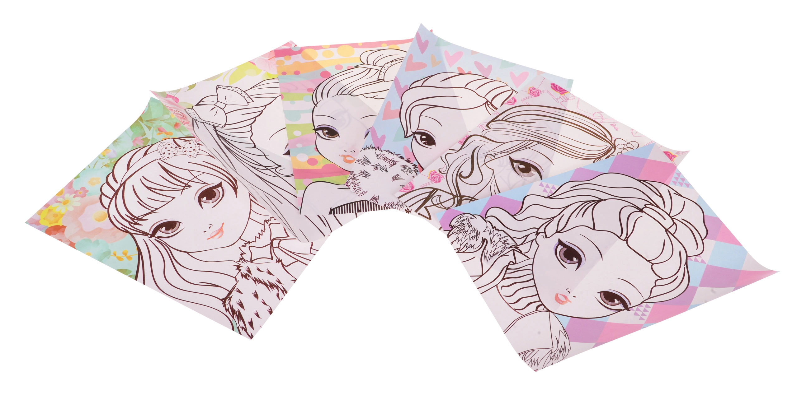 Komplektā iekļauti šabloni un attēli ar princesēm, kas ļauj bērniem veidot savus zīmējumus un krāsojumus.