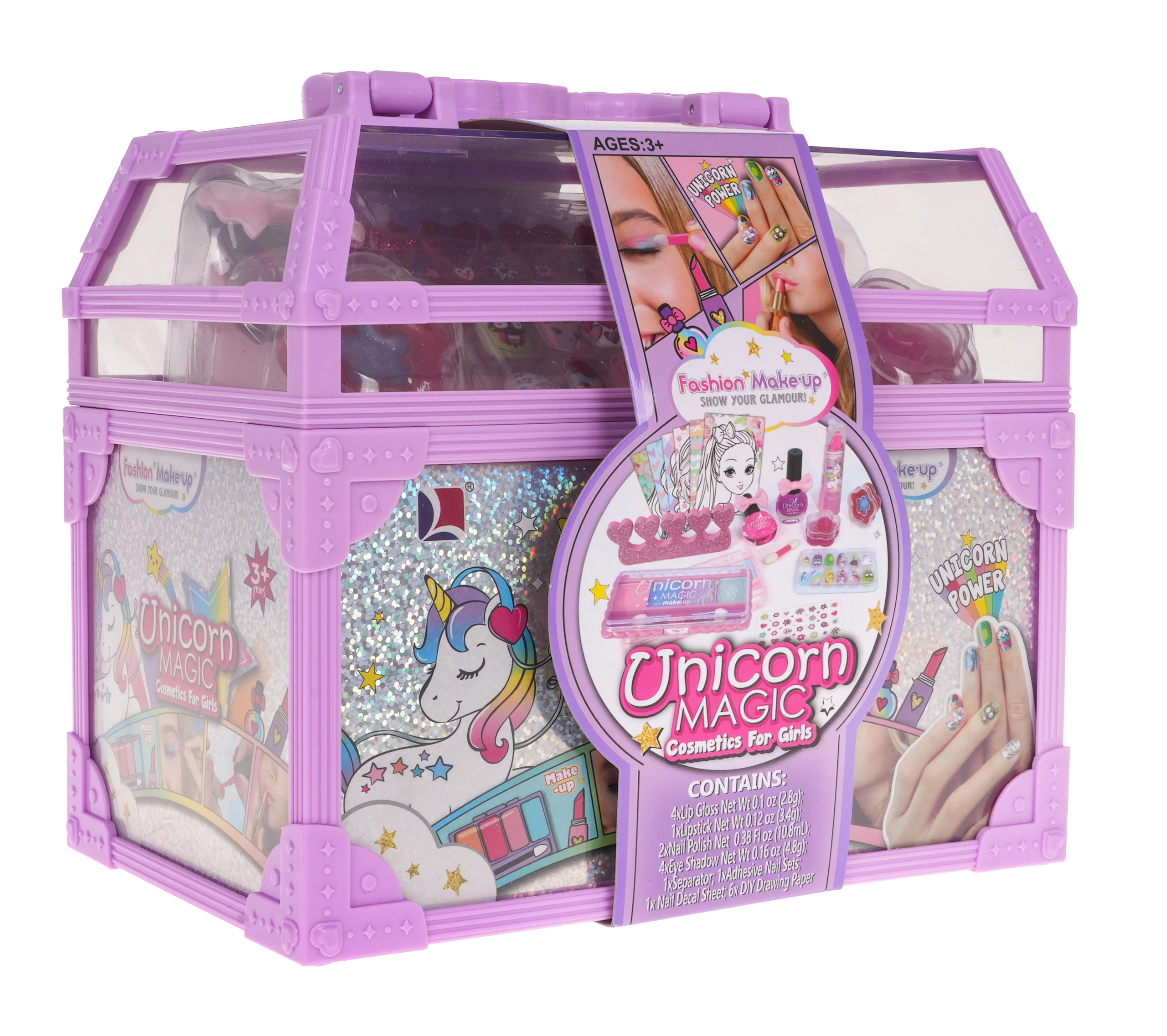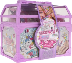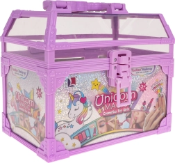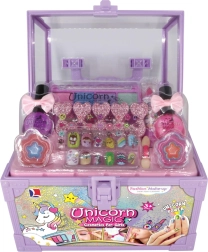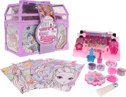 Satur dažādu krāsu nagu lakas, lūpu spīdumus un acu ēnas. Viss ir ievietots dekoratīvā kastītē ar vienradža motīvu.