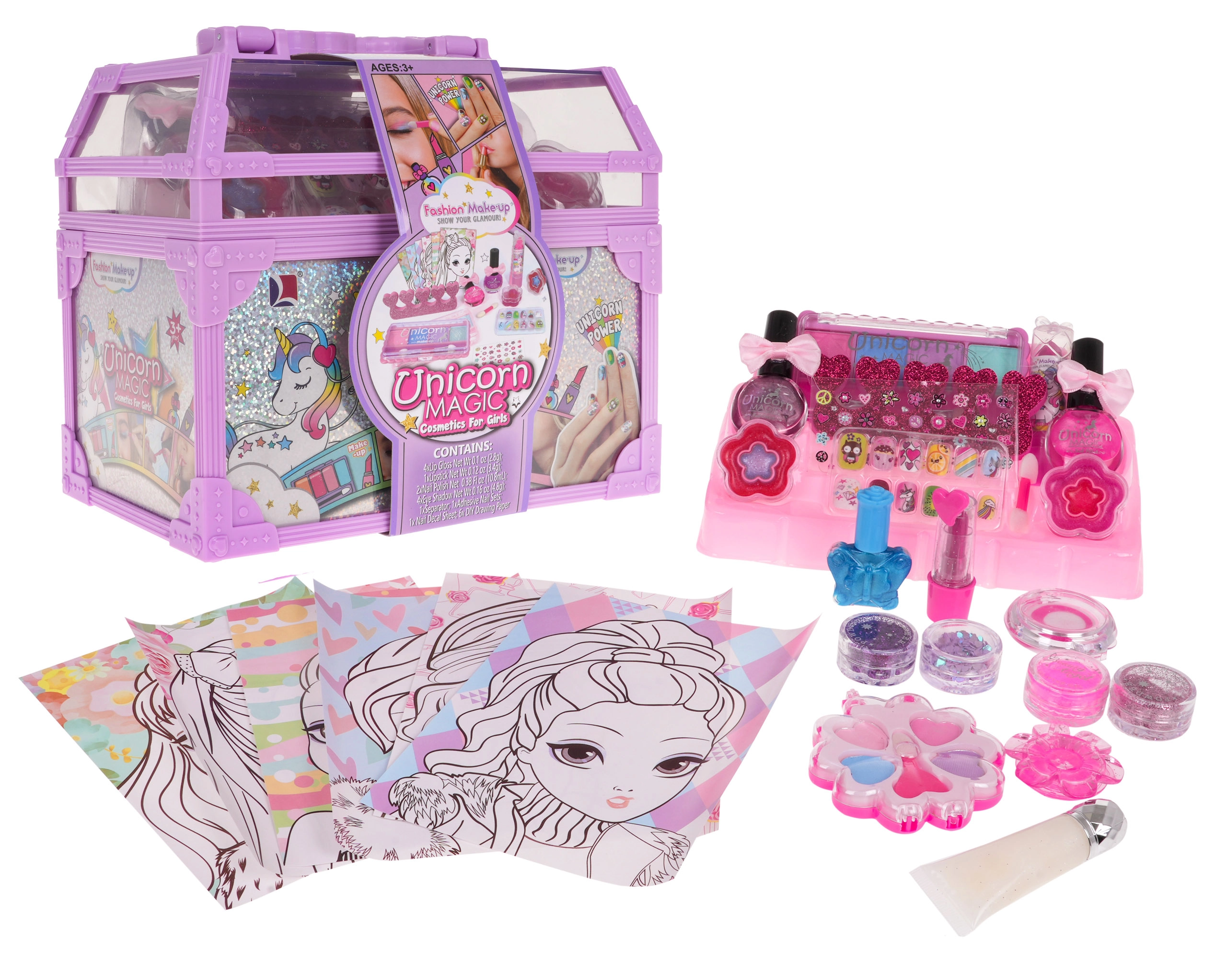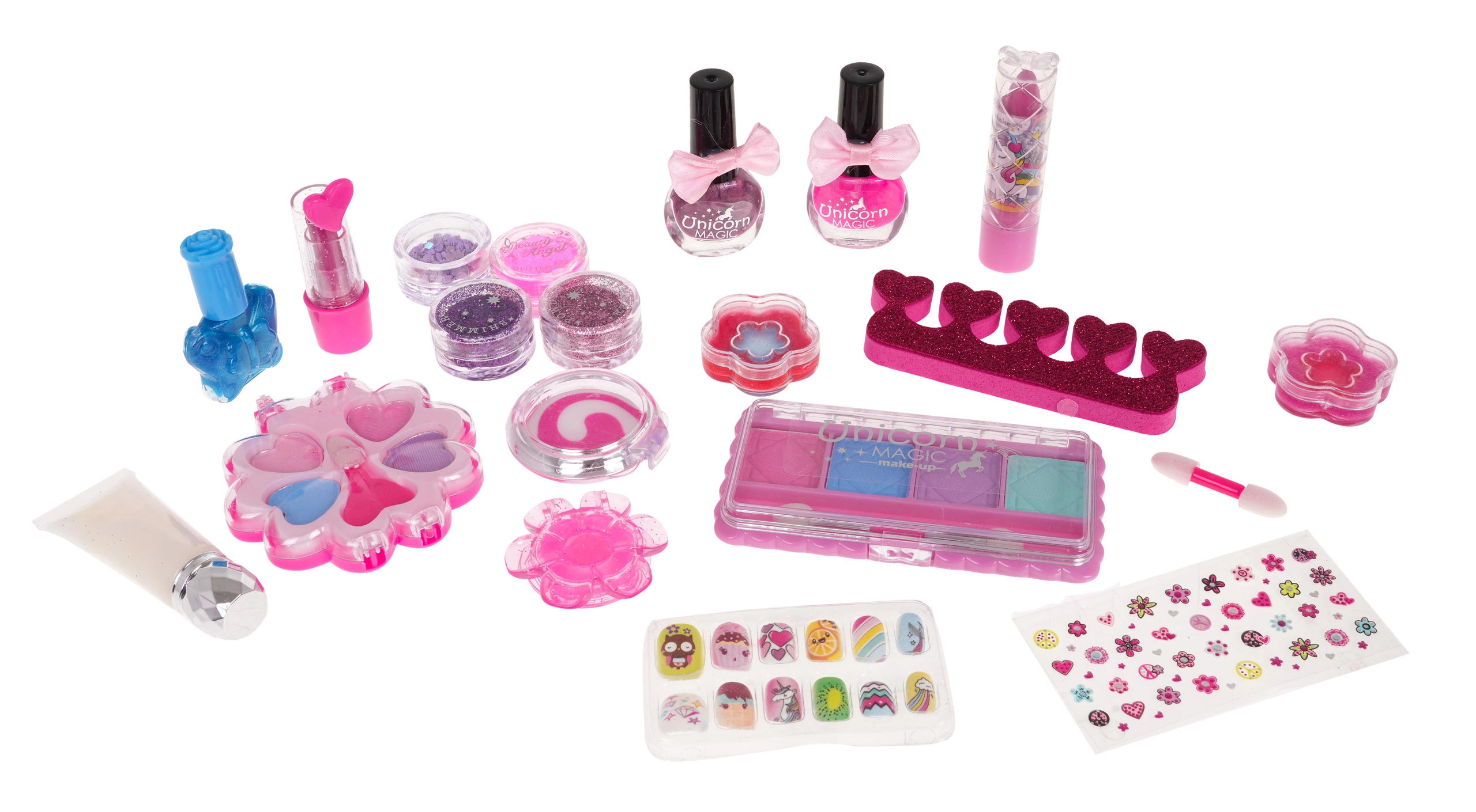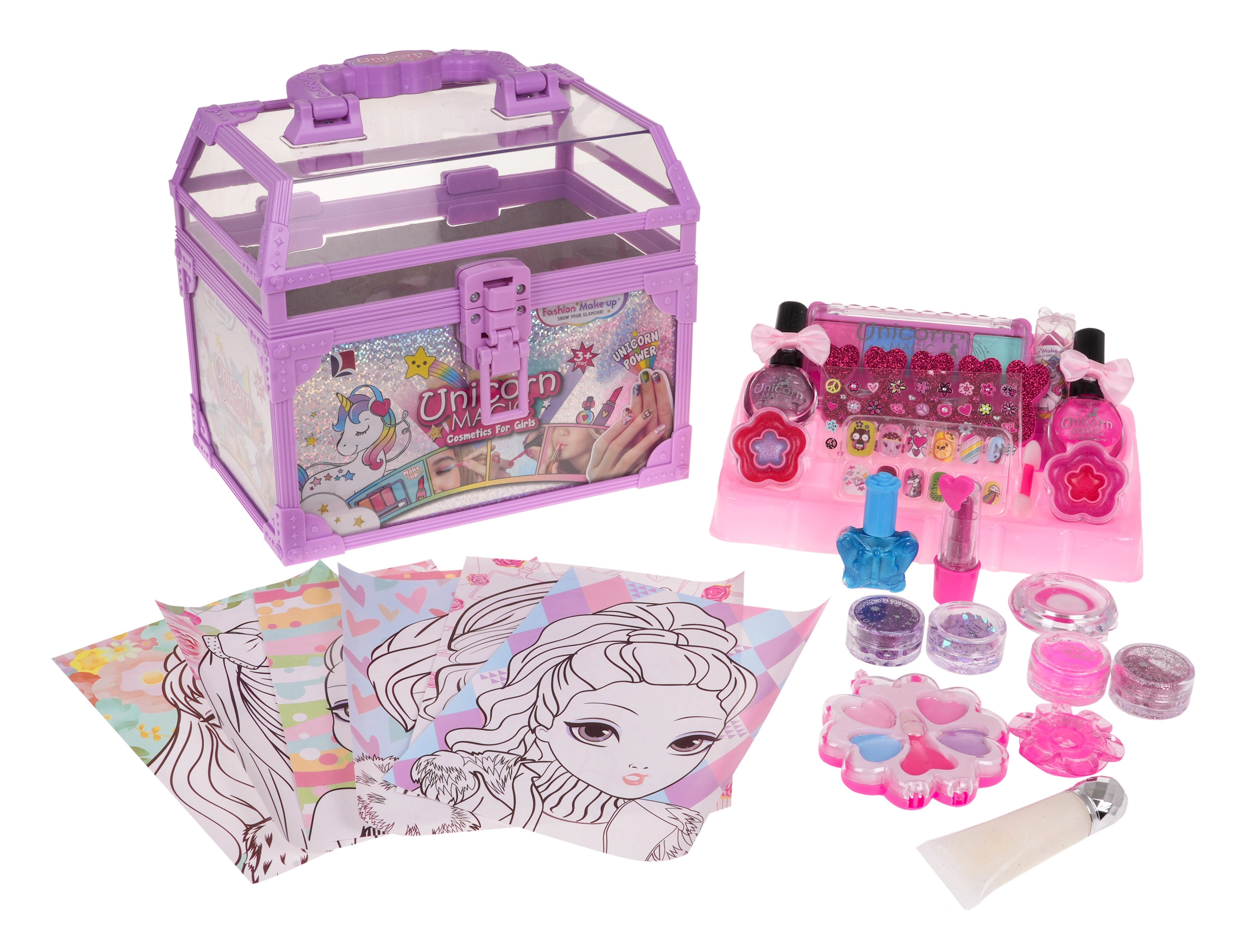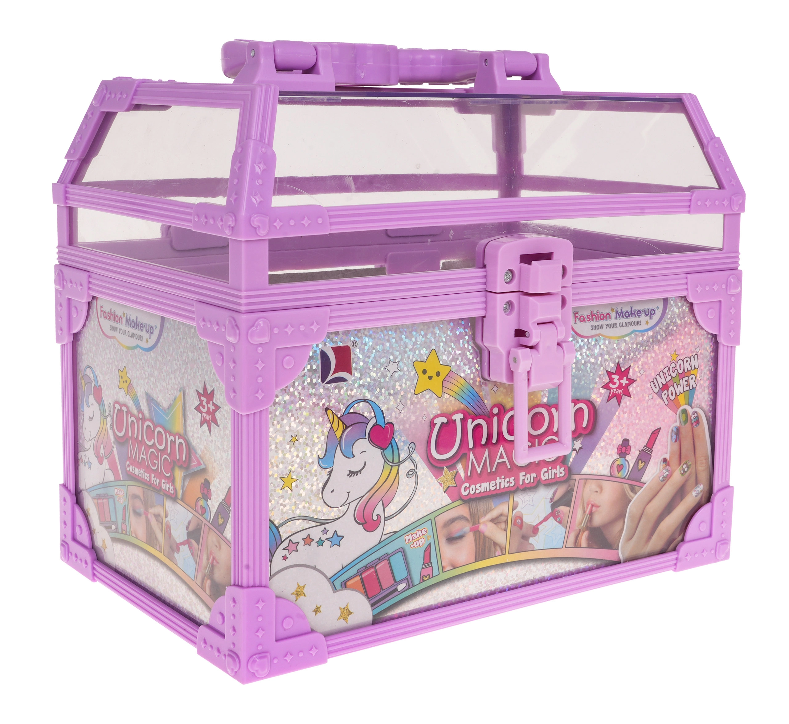 Kosmētikas komplekts princesēm ietver plašu drošu kosmētikas izstrādājumu klāstu praktiskā vienradža tematikas lādē. Lādei ir rokturis ērtai pārnēsāšanai, kas bērniem ļauj paņemt līdzi savus iemīļotos kosmētikas piederumus jebkur.