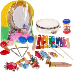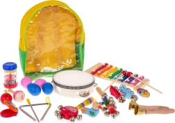 Atklājiet daudzveidīgu koka mūzikas komplektu bērniem no 2 gadu vecuma ar praktisku, caurspīdīgu mugursomu. Komplektā ir 22 koši krāsoti instrumenti, tostarp ksilofons, tamburīns, marakasas, trijstūris, zvārguļi un ola–šakers. Droši materiāli, izturīgs izpildījums un daudz skaņu veicina sensoro attīstību, ritmiku un smalko motoriku – ideāli pirmajai muzikālajai iepazīšanai mājās un ceļā.