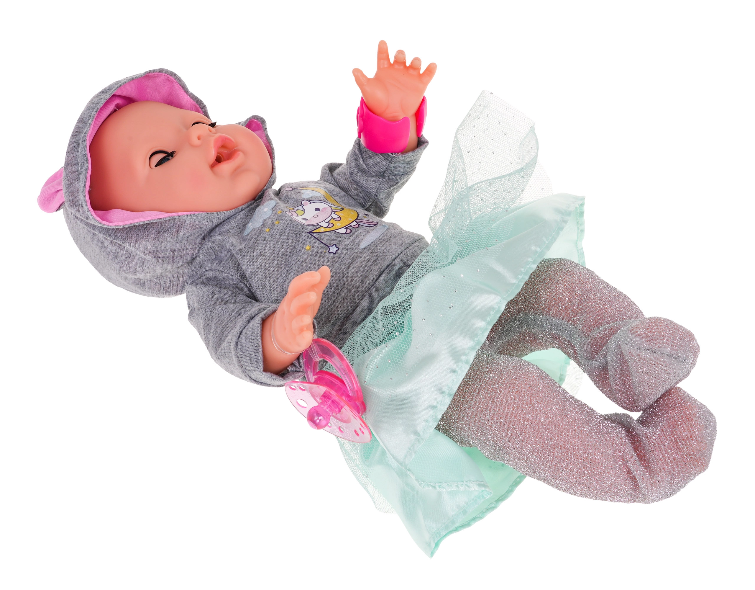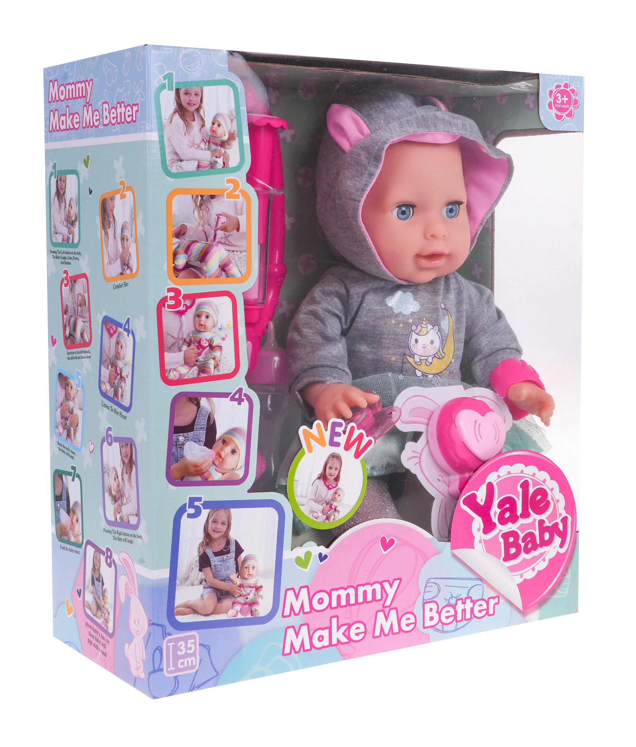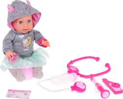 Mīlīga interaktīva lelle bērniem no 3 gadu vecuma piedāvā reālistisku rūpes par bēbīti un ārsta lomu spēli. Tā prot raudāt, smieties, šķaudīt un klepot, aizvērt un atvērt acis, dzert ūdeni un čurāt podiņā. Kad “saslimst”, vaigi iedegas kā drudža laikā. Komplektā ir bagātīgi medicīnas piederumi, tostarp magnētiskais knupītis, šļirce, termometrs, ūdens pudele un stetoskops ar gaismu un skaņām.