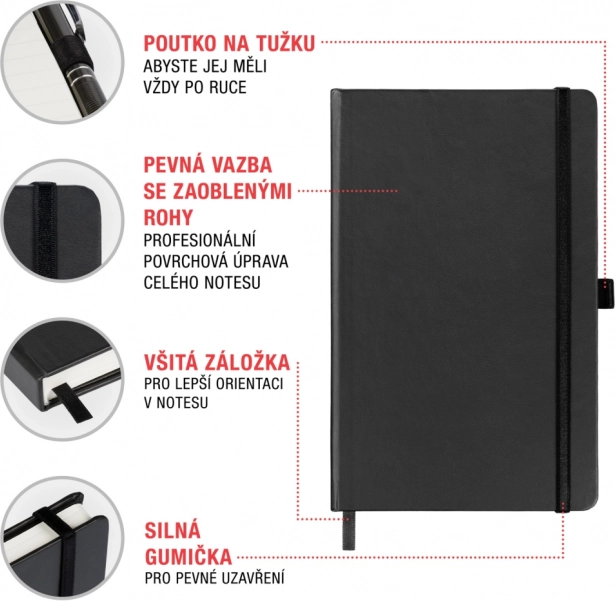 Cietie vāki, elastīgā gumija, iekšējā kabata un pildspalvas cilpa pasargā saturu un uztur visu kārtībā – no vizītkartēm līdz ātrajām piezīmēm.