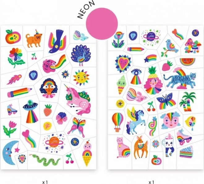 DJECO Rainbow tetovējumu komplekts piedāvā košas krāsas un smalkas, gaumīgas ilustrācijas, kuras bērniem patiks. Uzklāšana ir acumirklīga – vienkārši izgriez, noņem plēvi un piespied; tetovējums uzreiz pārnesas uz ādas bez ūdens.