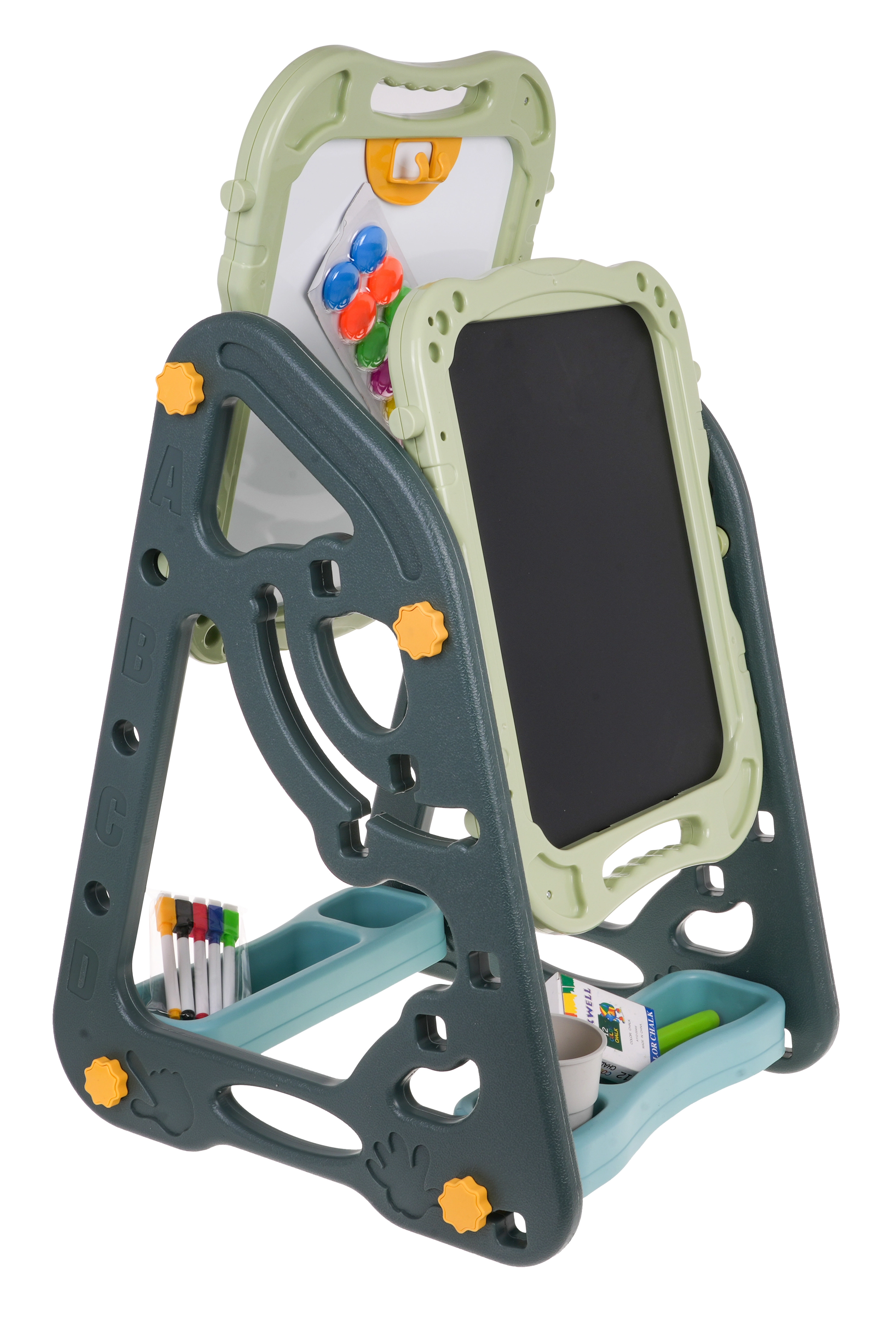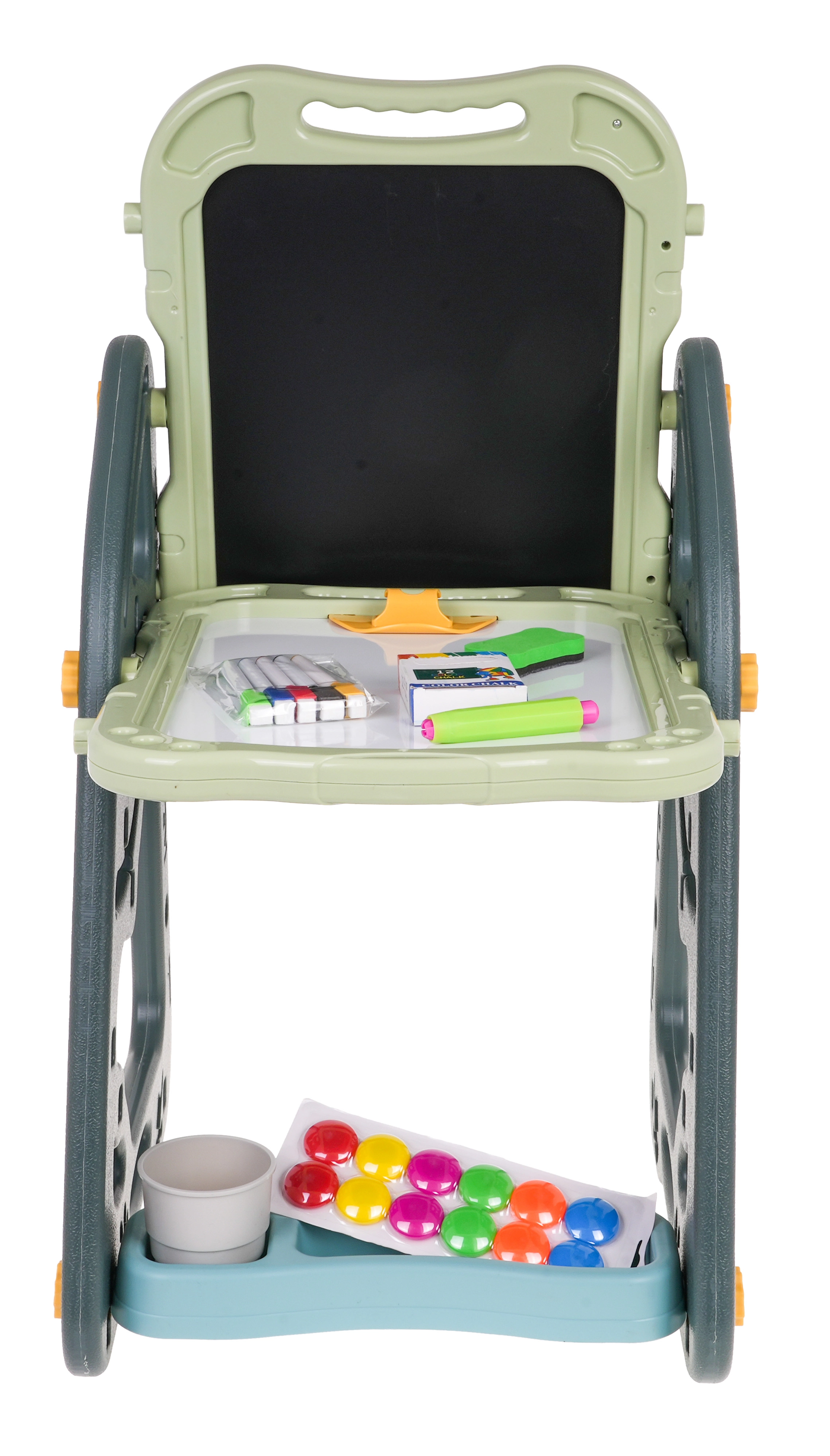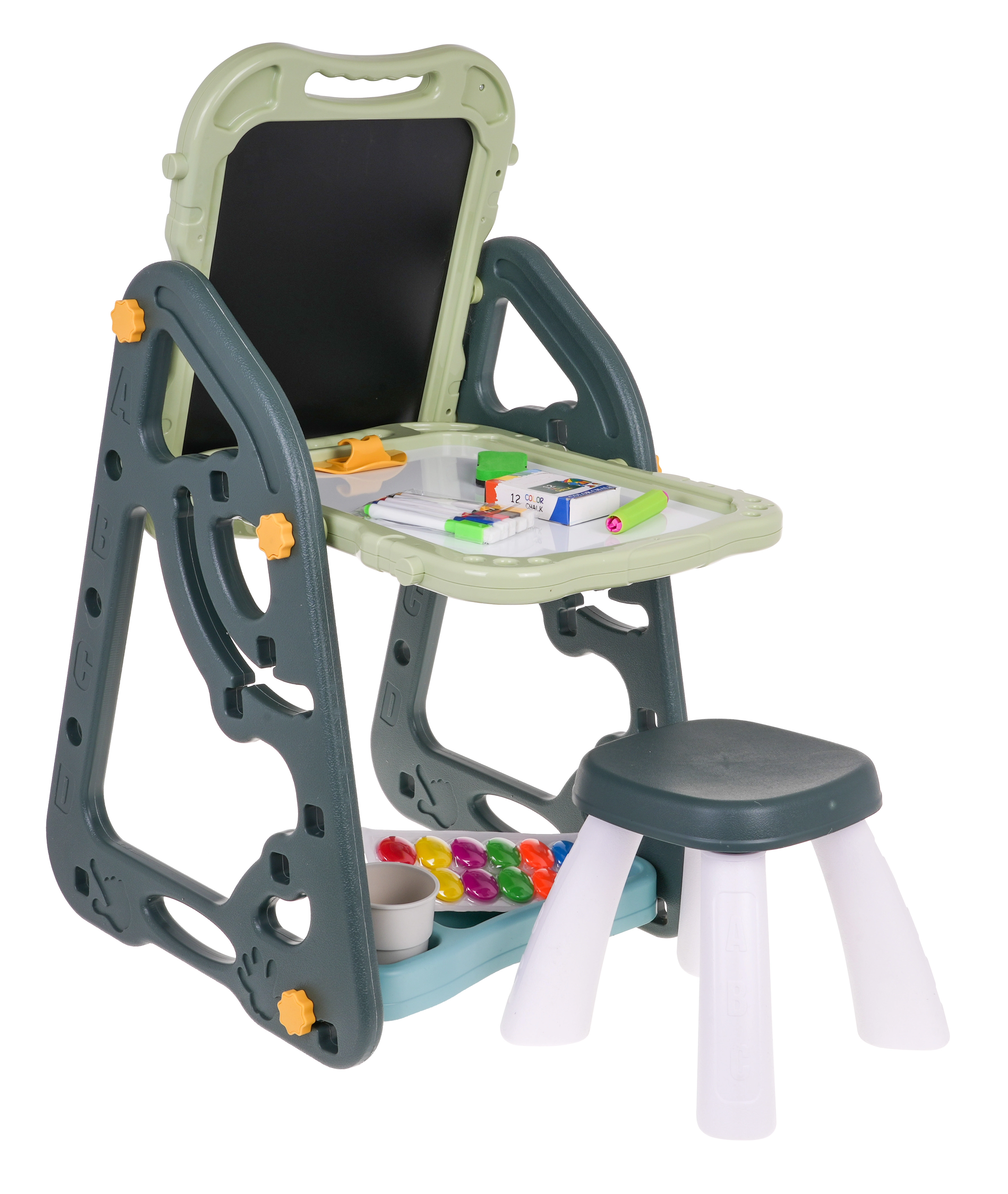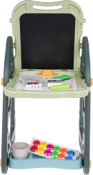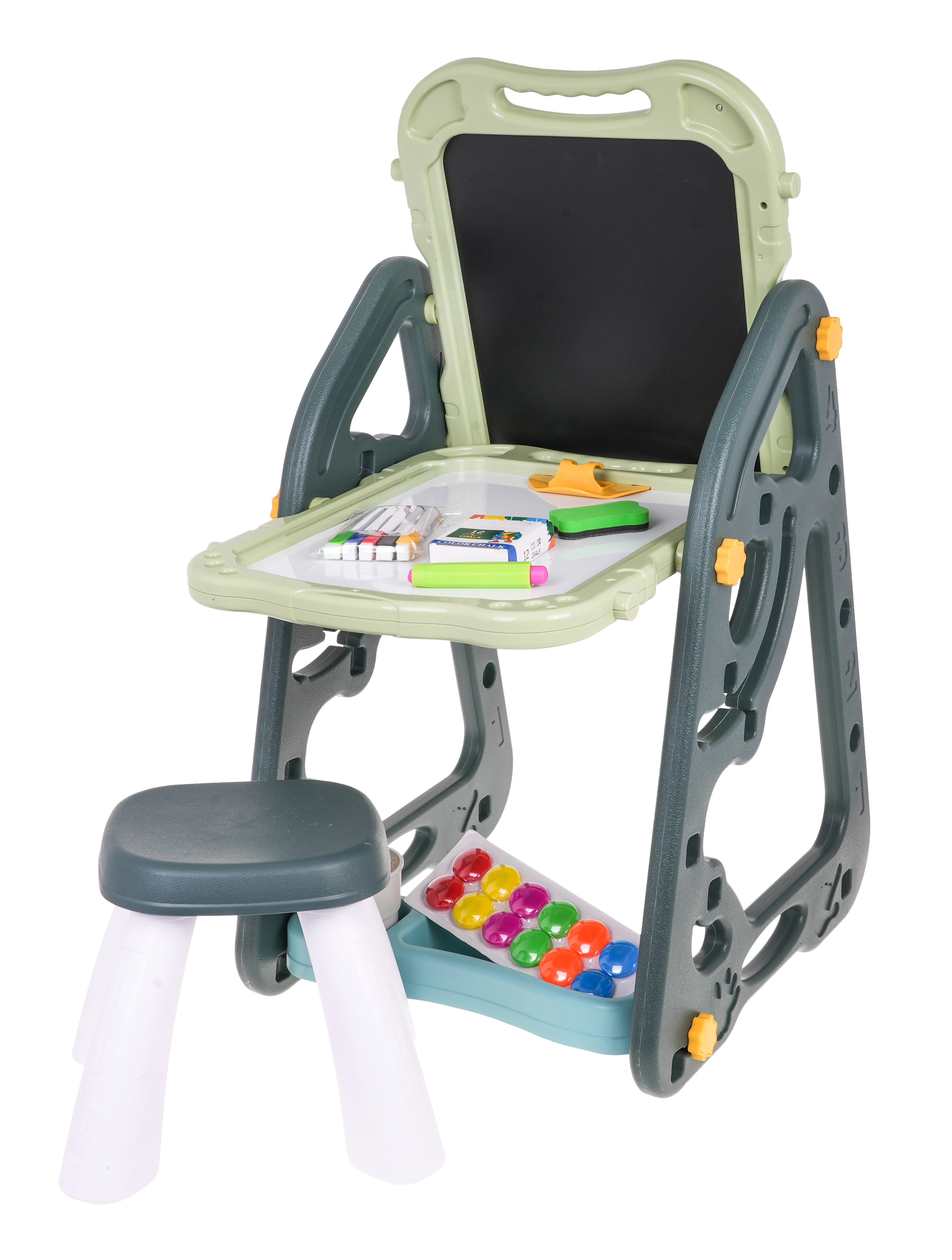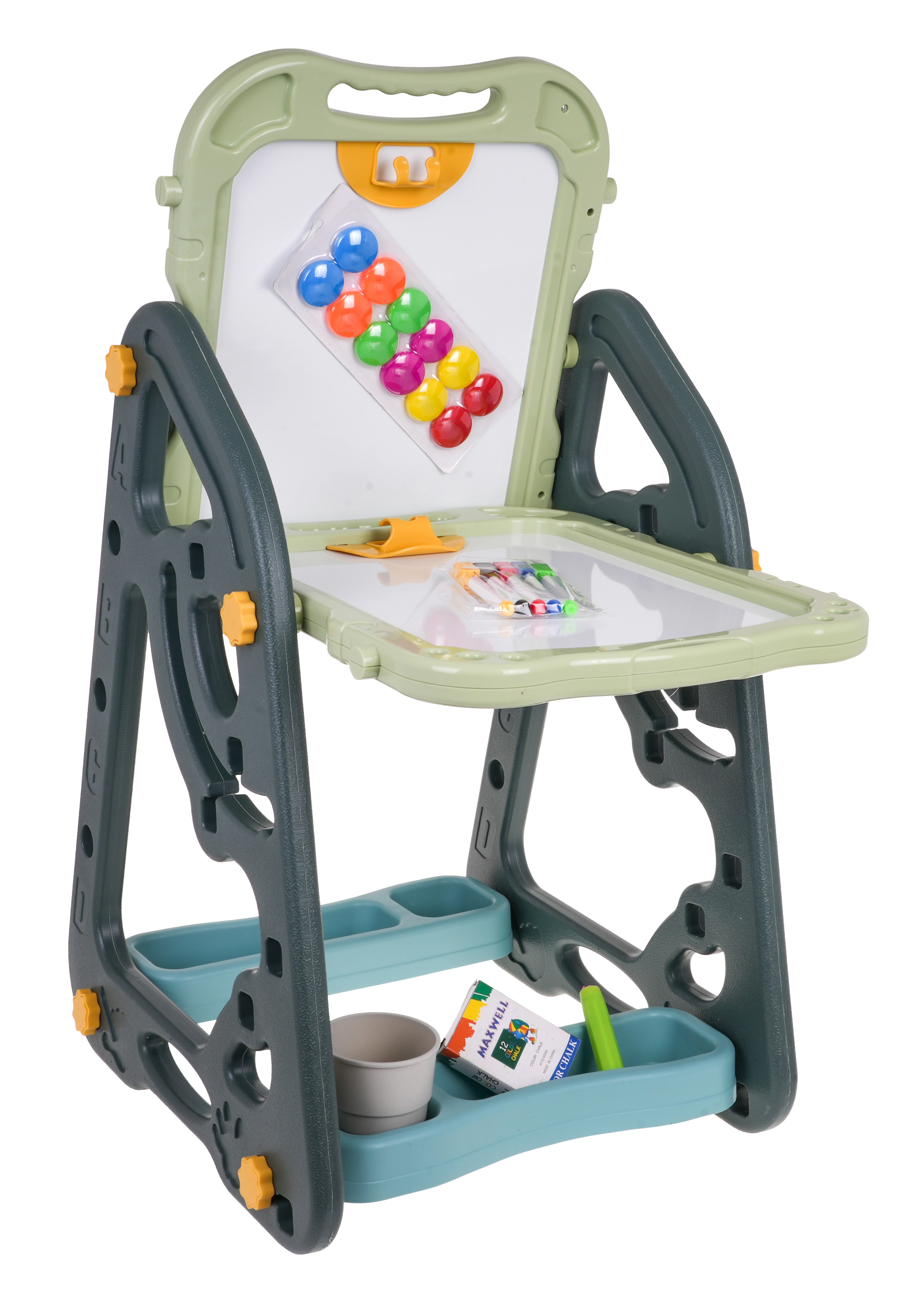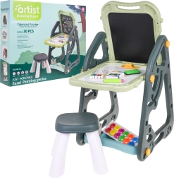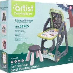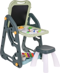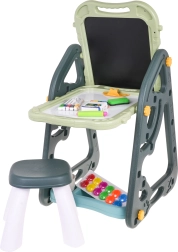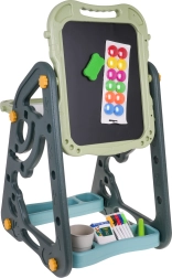 Lielais multifunkcionālais komplekts sastāv no divām tāfelēm: krīta un magnētiskās, kā arī ērta solīša un ir ideāla izvēle bērniem no 3 gadu vecuma. Tāfeles var iestatīt divās pozīcijās – vienā pusē magnētiskā, otrā krīta, vai arī kā galdiņu ar virsmu zīmēšanai. Uz baltās puses var rakstīt ar flomāsteriem vai piestiprināt krāsainus magnētus, savukārt melnā puse paredzēta zīmēšanai ar krītu. Komplektā ir arī divas plauktiņas mākslinieciskajiem piederumiem.