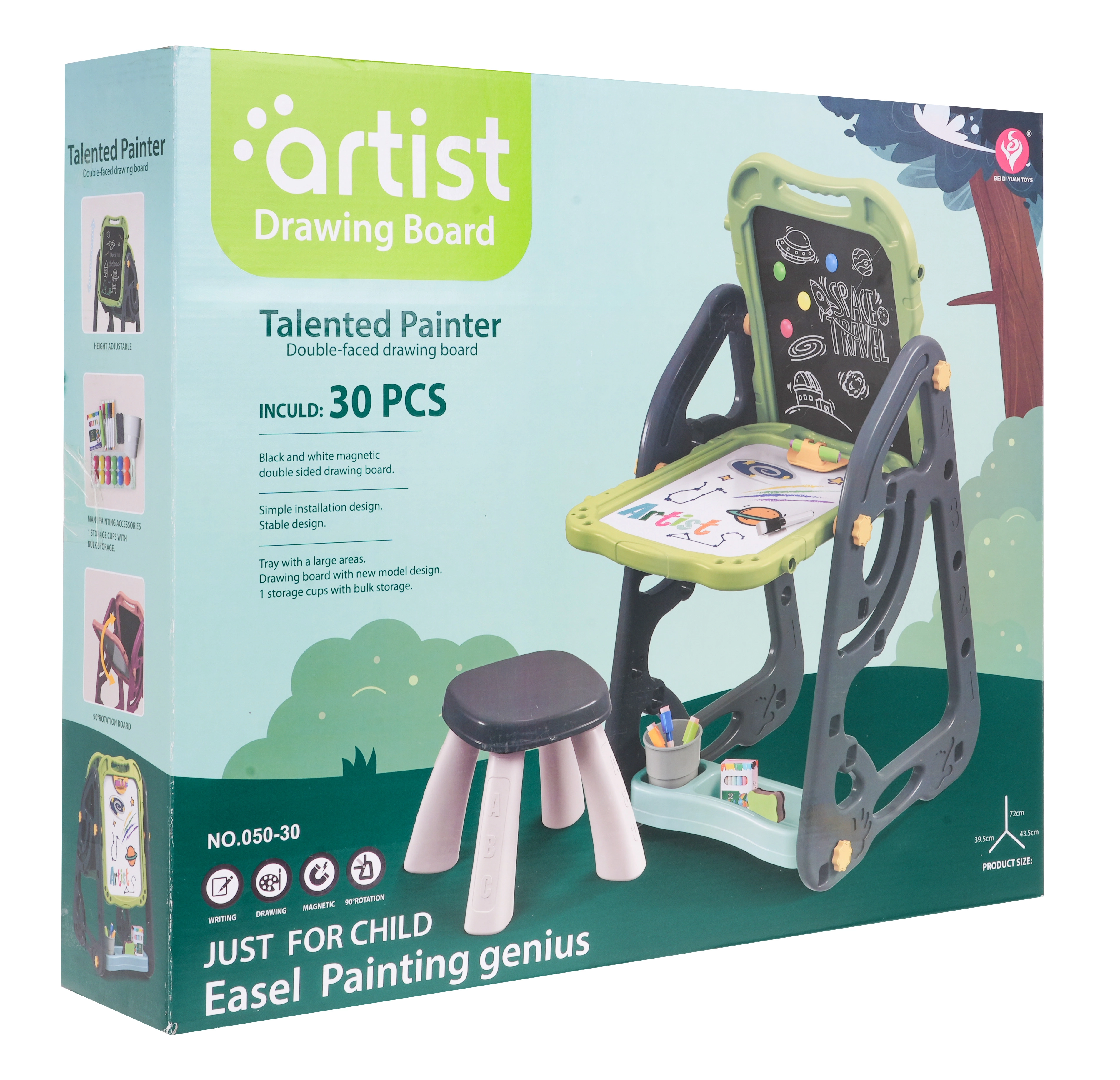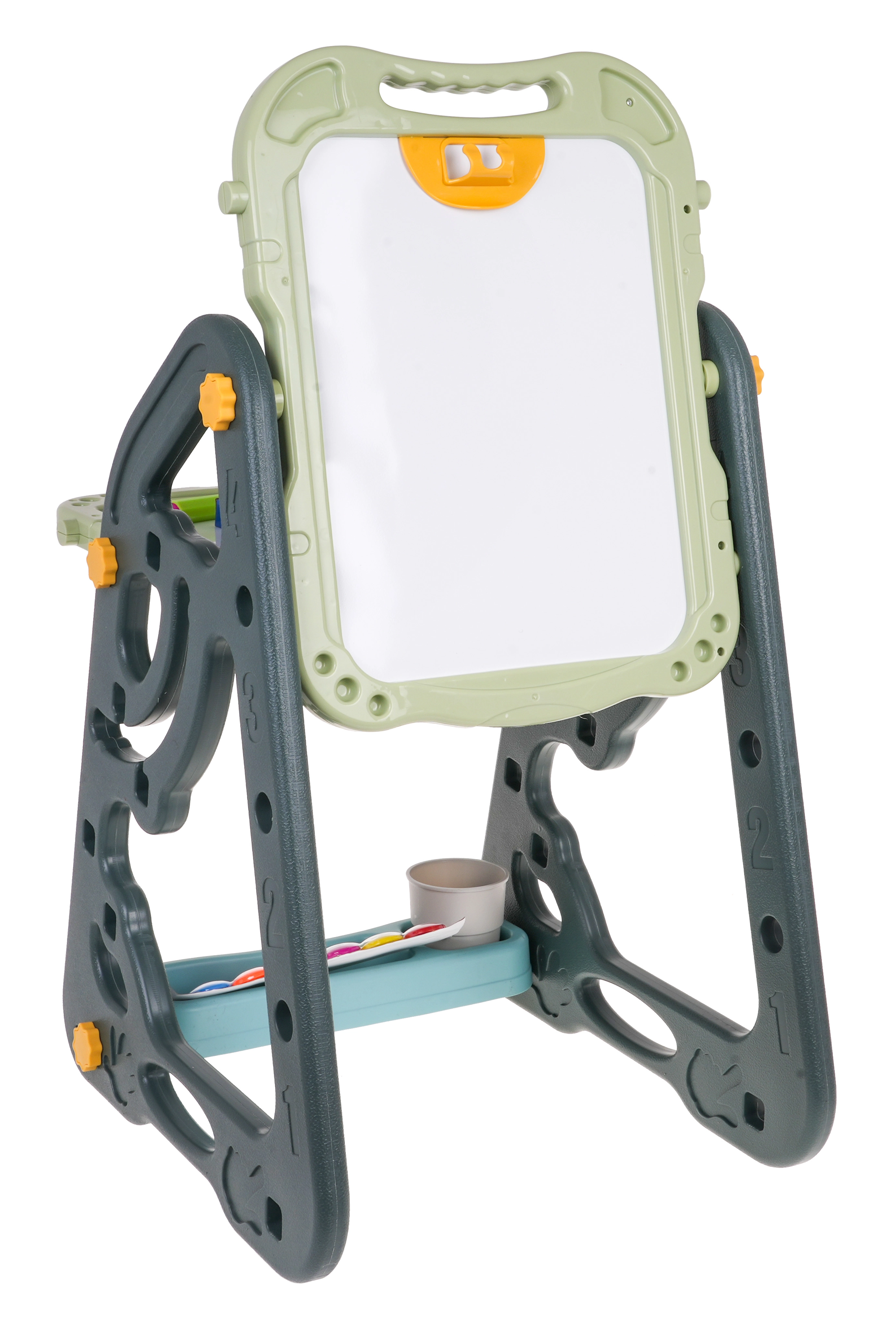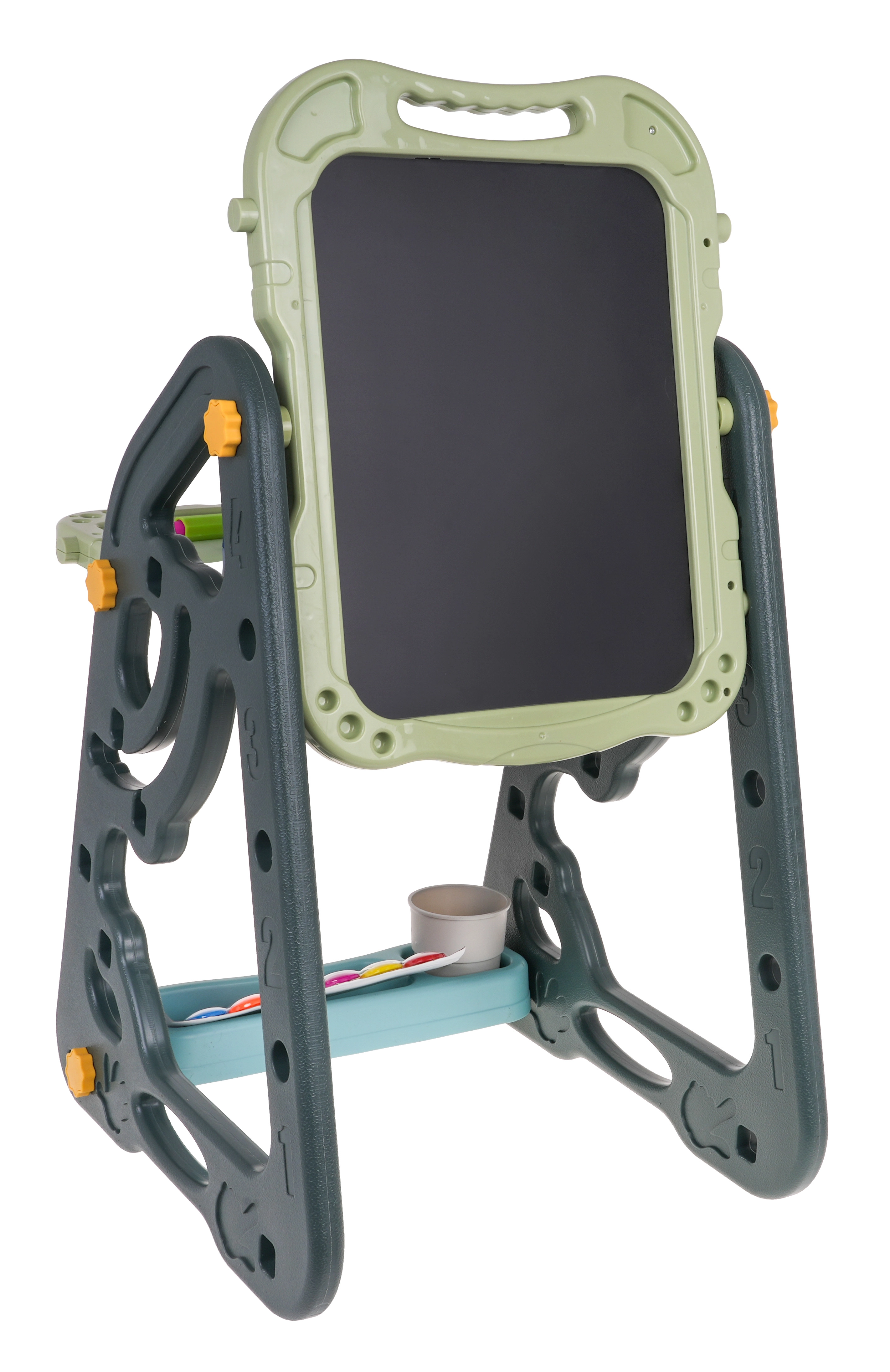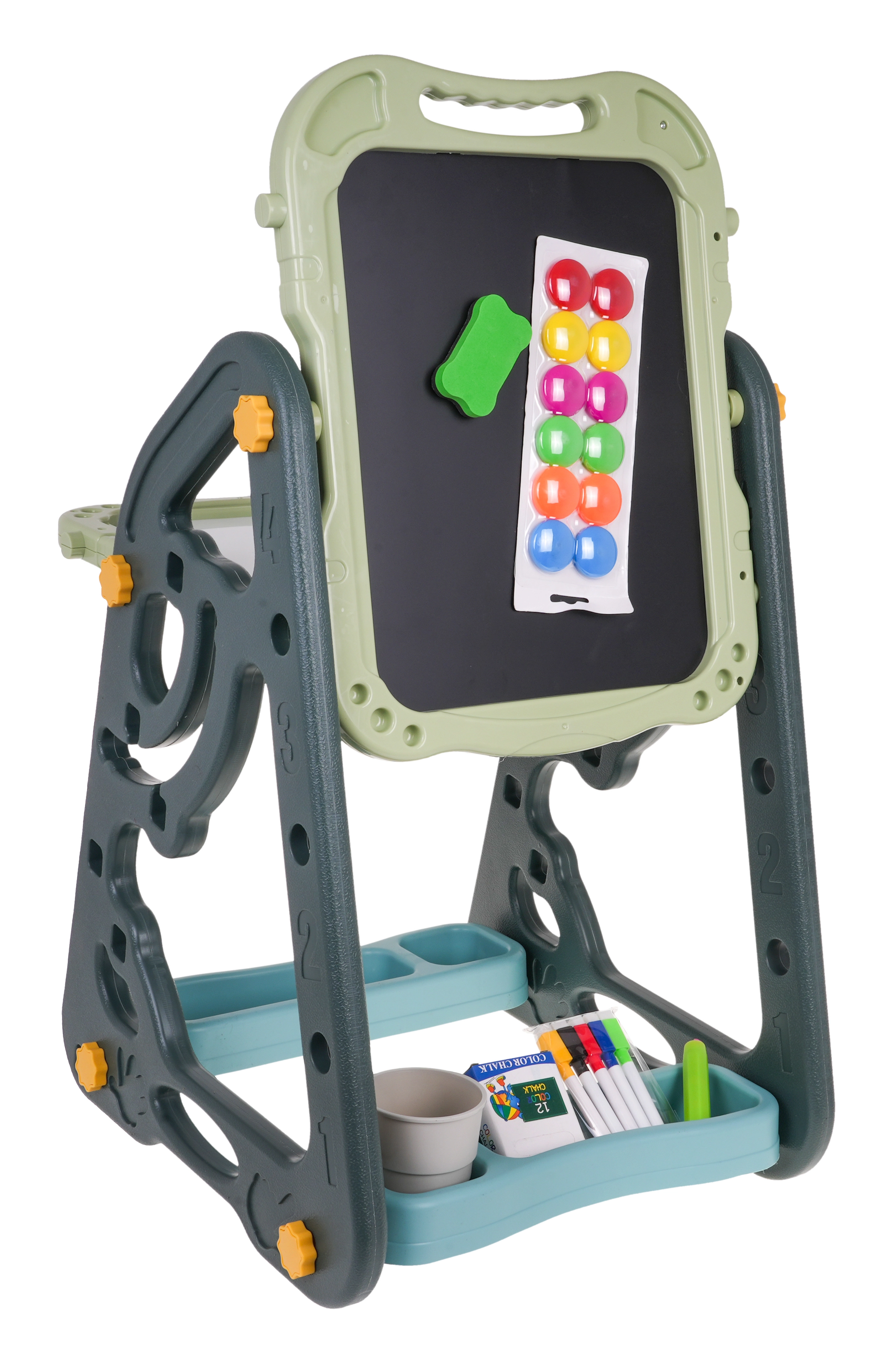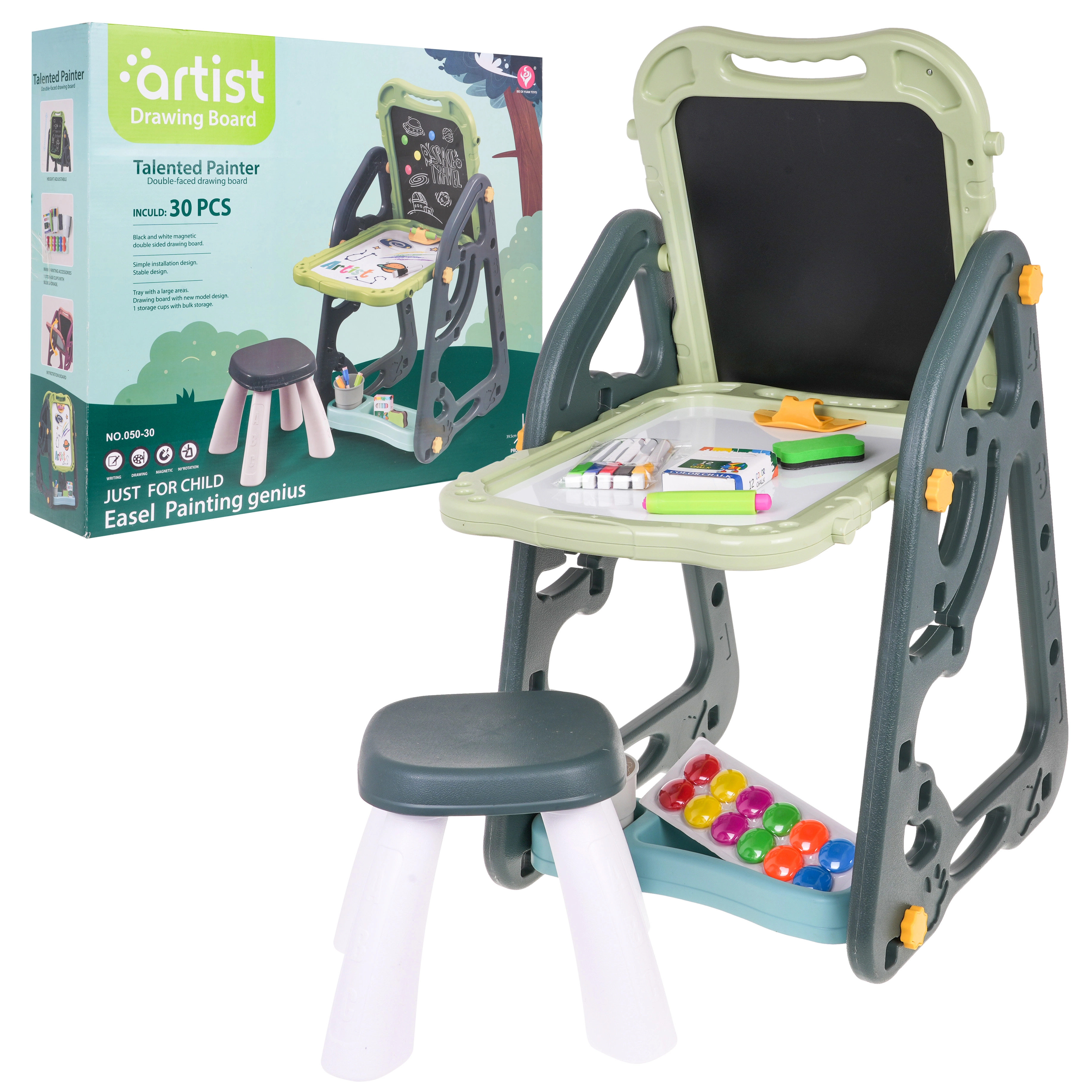 Lielais multifunkcionālais komplekts sastāv no divām tāfelēm: krīta un magnētiskās, kā arī ērta solīša un ir ideāla izvēle bērniem no 3 gadu vecuma. Tāfeles var iestatīt divās pozīcijās – vienā pusē magnētiskā, otrā krīta, vai arī kā galdiņu ar virsmu zīmēšanai. Uz baltās puses var rakstīt ar flomāsteriem vai piestiprināt krāsainus magnētus, savukārt melnā puse paredzēta zīmēšanai ar krītu. Komplektā ir arī divas plauktiņas mākslinieciskajiem piederumiem.