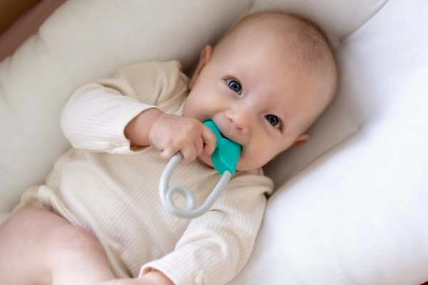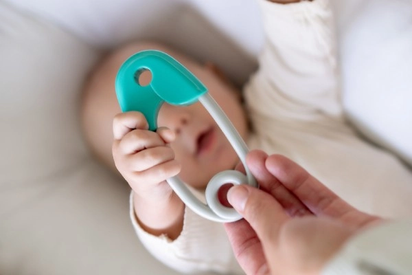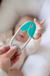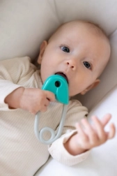 Bērnu grabulītis drošības adata ir nepieciešama sastāvdaļa ikviena mazuļa attīstībā. Tas ir izstrādāts tā, lai ērti ietilptu mazajās rokās, tirkīza‑pelēkā dizainā, kas stimulē bērna vizuālo uztveri. Grabulītis ir aprīkots ar sīkām lodītēm, kas kustoties maigi grab, noturot bērna uzmanību un veicinot dzirdes attīstību.