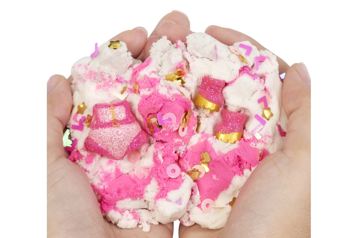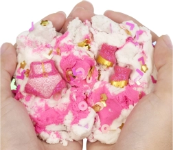 Rozā un baltās krāsas kinetiskās smiltis ļauj bērniem veidot un modelēt formas pēc savas fantāzijas. Smiltis satur arī nelielus dekoratīvus elementus.
