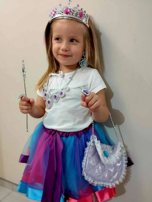 Burvīgs 9 daļu komplekts acumirklī pārvērtīs ikvienu bērnu īstā princesē. Krāsainie tutu svārki rozā, violetos un zilajos toņos izceļas ar kuplām tilla kārtām un ērtu jostasvietu. Elegantā tiāra ar rozā akmentiņiem, mirdzoša kaklarota un auskari piešķir svinīgu izskatu, savukārt burvju nūjiņa un mīlīgā somiņa pabeidz koptēlu.