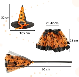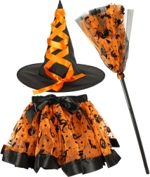 Stilīgs bērnu raganas kostīms oranži-melnā kombinācijā iepriecinās gan Helovīnā, gan masku ballē. Komplektā ir 3 elementicepure, tutu svārki un slotas kāts. Pateicoties elastīgajai jostasvietai, der dažādām ķermeņa formām un ir ideāli piemērots karnevālam, tematiskām ballītēm un ikdienas rotaļām.