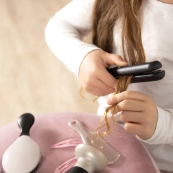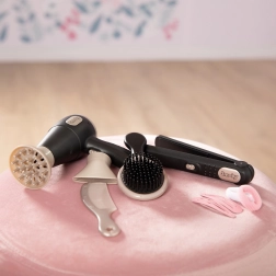 Maināmi fēna uzgaļi, matu taisnotājs, birste, ķemme, spraudītes un gumijas – viss radošu frizūru veidošanai.