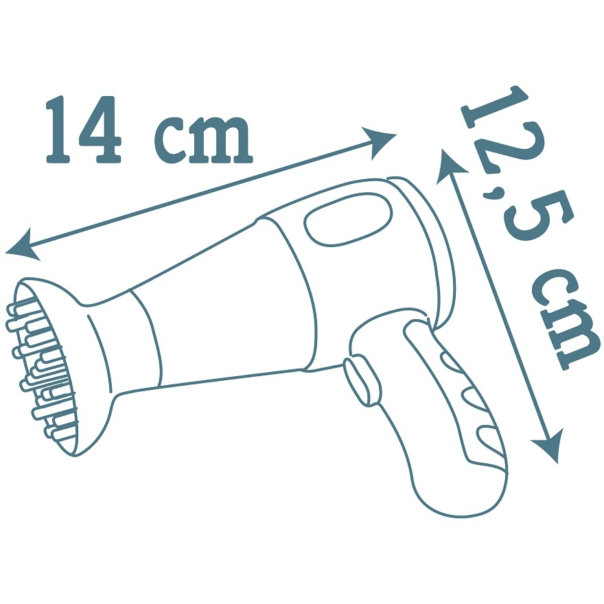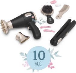 - Pilns aprīkojums: fēns ar gaismas un skaņas efektiem, maināmi uzgaļi, matu taisnotājs, birste, ķemme, spraudītes un gumijas.