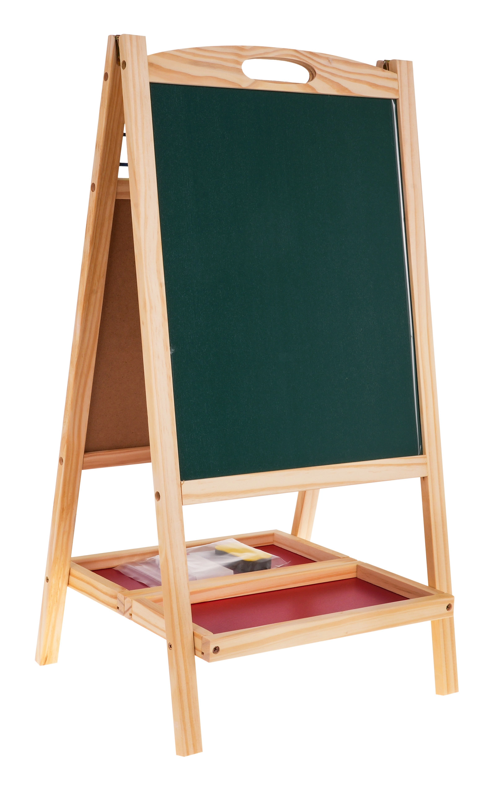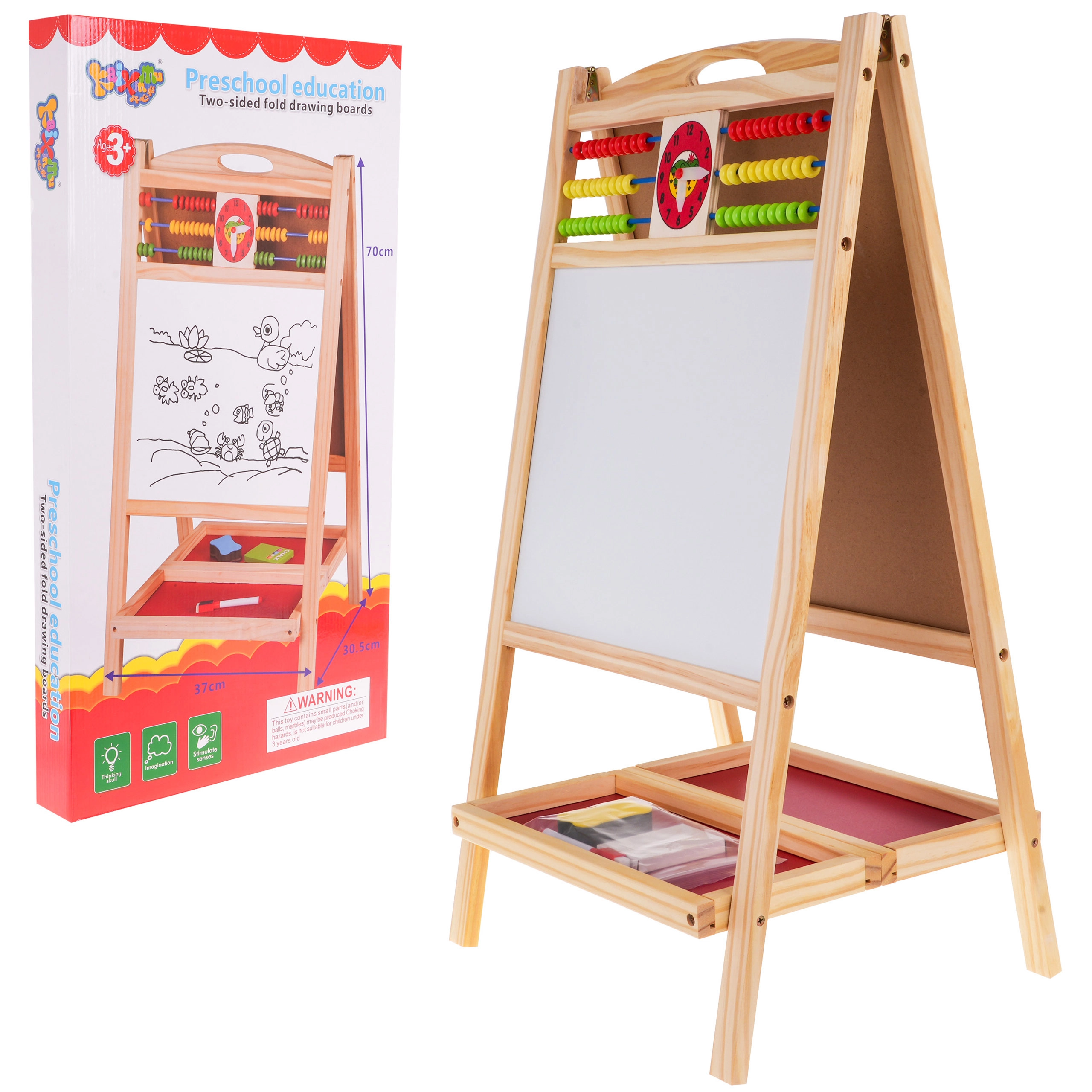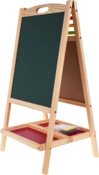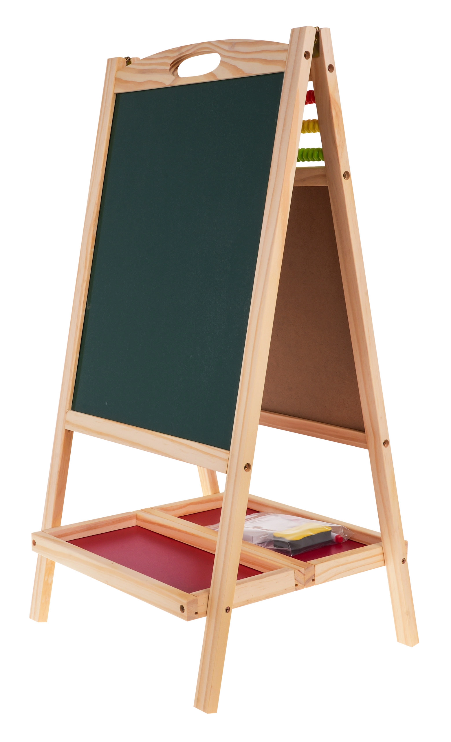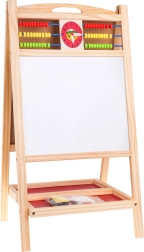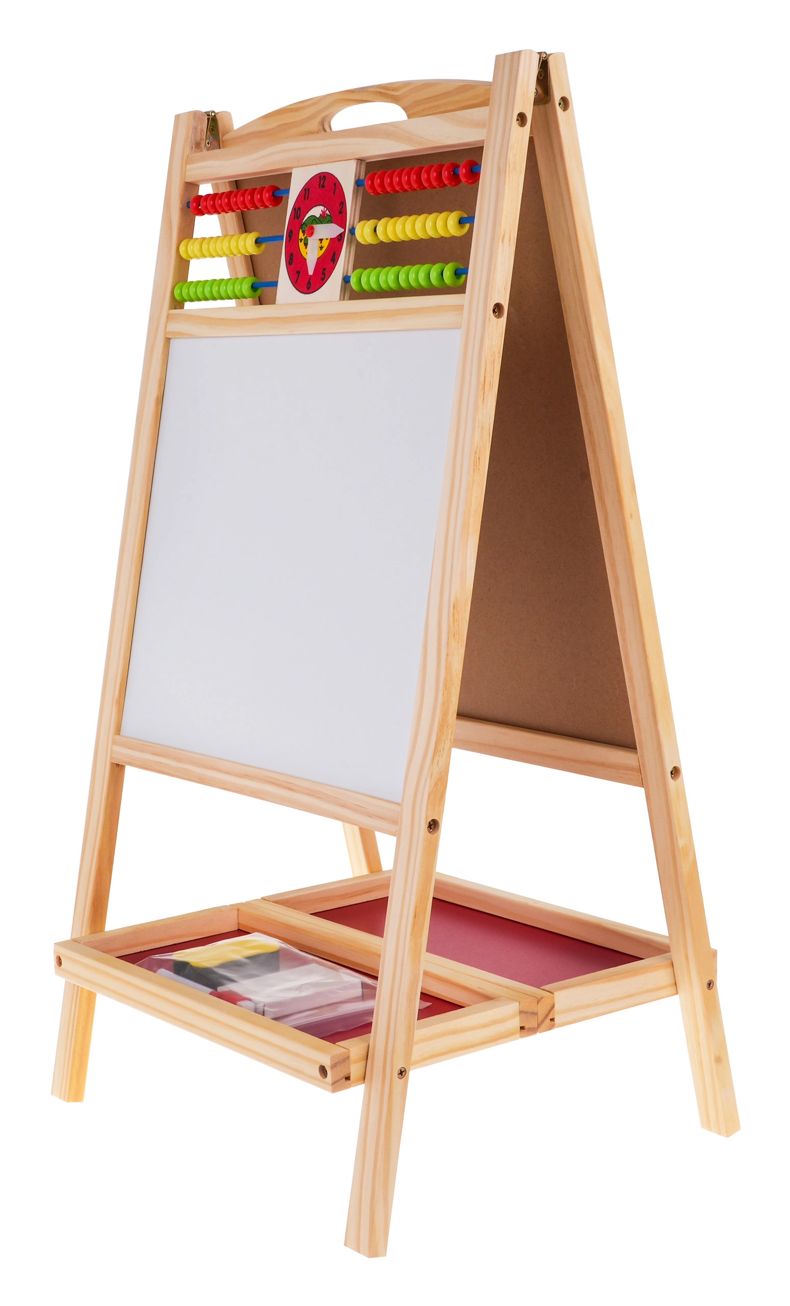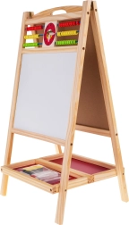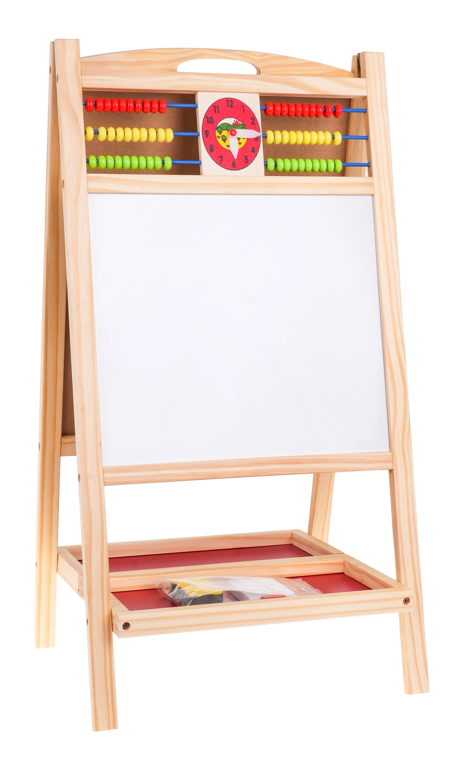 Šī daudzfunkcionālā koka stāvošā tāfele apvieno magnētisko balto virsmu un klasisko krītu pusi, lai bērni varētu rakstīt, zīmēt un apgūt pirmos burtus un ciparus. Augšējā daļā ir skaitīkls un pulkstenis ar kustīgām rādītājām, kas dabiski veicina skaitīšanu un orientēšanos laikā.