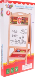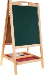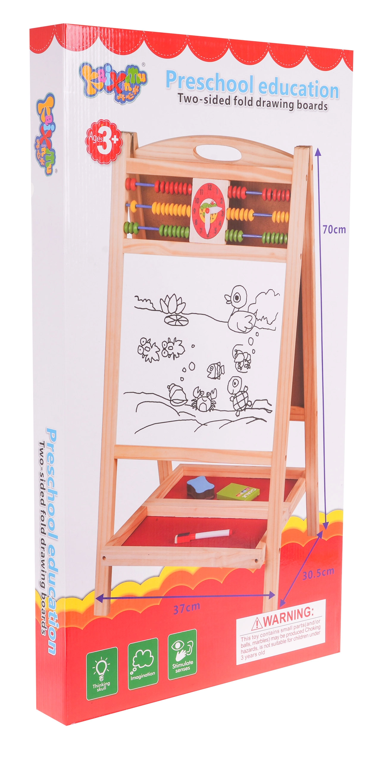 Praktiska un stabila koka tāfele bērniem no 3 gadu vecuma piedāvā no vienas puses balto magnētisko virsmu marķierim un no otras krītu tāfeli. Augšpusē ir skaitīkls un pulkstenis ar kustīgām rādītājām rotaļīgai mācībai. Komplektā ir magnētisks marķieris ar dzēšgumiju, krāsaini krītiņi, sūklis un dubultā novietošanas plaukts. Lieliski attīsta sīko motoriku, radošumu un koncentrēšanos.