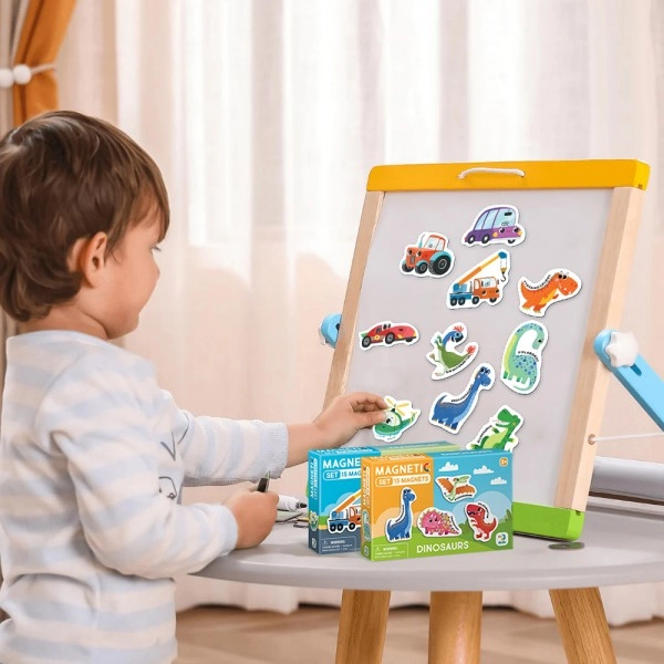 - Mācīšanās caur spēli: Ar magnētu palīdzību ar attēliem un dinozauru nosaukumiem bērni jautri padziļinās zināšanas un zinātkāri par pirmatnējiem radījumiem.
