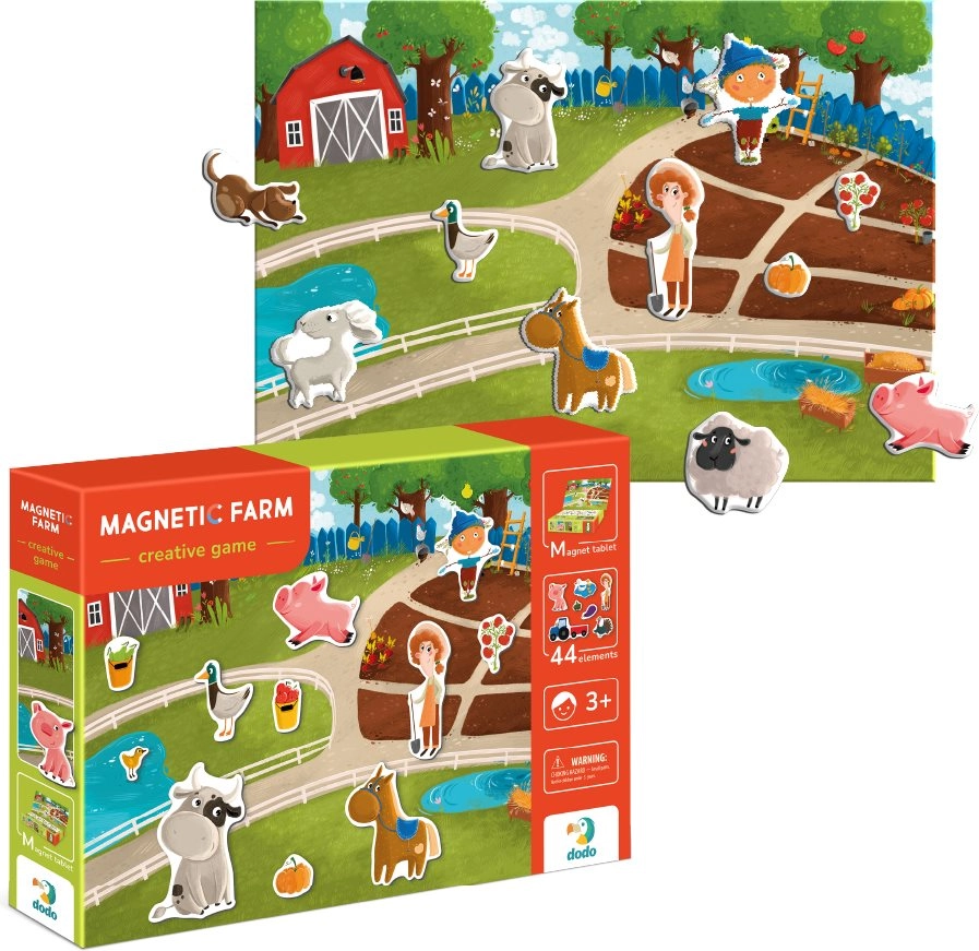 Atklājiet jautro mājdzīvnieku pasauli ar Dodo magnētisko spēli. Komplektā ir magnētiska plāksne un 44 magnētiski elementi, ar kuriem bērni veido savus stāstus, attīsta iztēli, radošumu un sīko motoriku. Praktiskā kastīte kalpo kā balsts, tāpēc spēle ir ideāla gan mājās, gan ceļā.
