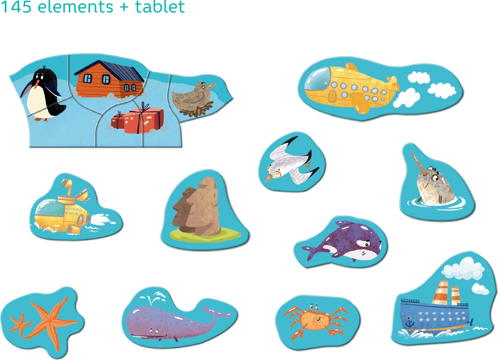 Komplektā ir arī aktivitātes ar uzlīmēm un piederumiem, kas nodrošina papildu izklaides un mācīšanās līmeņus.