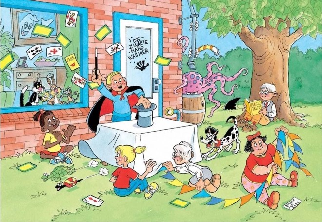 Atklājiet jautru ģimenes puzli ar ilustrāciju no leģendārā karikatūrista JAN VAN HAASTEREN. Komplektā ir 240 gabaliņi, un tas ir pilns ar humoriem sīkumiem, kas garantē daudzas stundas lieliskas izklaides. Sagaidiet raksturīgo haizivs spuru, noslēpumainas rokas un citus slēptus motīvus – viss par tēmu Burvju mākslinieks. Ideāli jaunākiem būvētājiem un kopīgai salikšanai ar vecākiem.