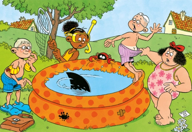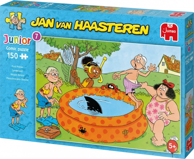 Ieniriet trakulīgās ainās no Junior sērijas – Joki pie baseina – no leģendārā karikatūrista JAN VAN HAASTEREN. Raksturīgie paraksti, piemēram, haizivs spura, negaidītas roka bez saimnieka, zobu protēze, Mikulāšs un autora pašportrets, pārvērš likšanu par smieklu pilnu meklēšanas piedzīvojumu.